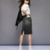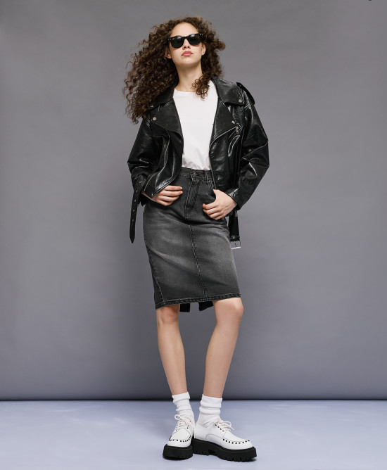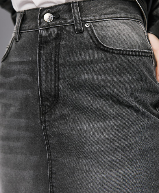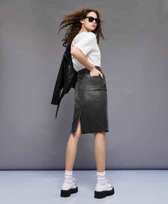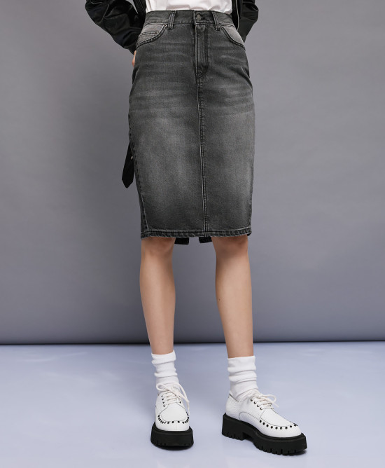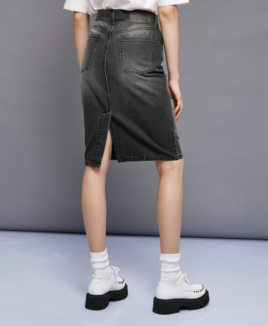 Με μίντι μήκος και κανονική γραμμή, εφαρμόζει όμορφα στο σώμα, ενώ η ελαφρώς ξεβαμμένη όψη της χαρίζει cool χαρακτήρα. Διαθέτει πλαϊνές τσέπες, patch τσέπες στο πίσω μέρος, καθώς και θηλύκια για ζώνη ώστε να προσαρμόζεται εύκολα στο προσωπικό σας στυλ. Το διακριτικό σκίσιμο πίσω προσθέτει θηλυκότητα και άνεση στην κίνηση.