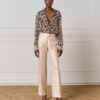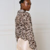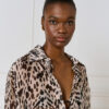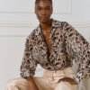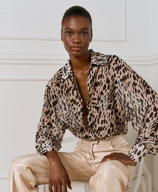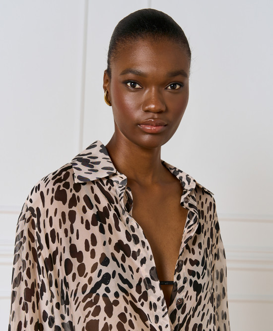 Μακρύ εμπριμέ πουκάμισο με γιακά, κουμπιά και μακριά μανίκια. Ημιδιαφανές ύφασμα για κομψές και αέρινες εμφανίσεις.