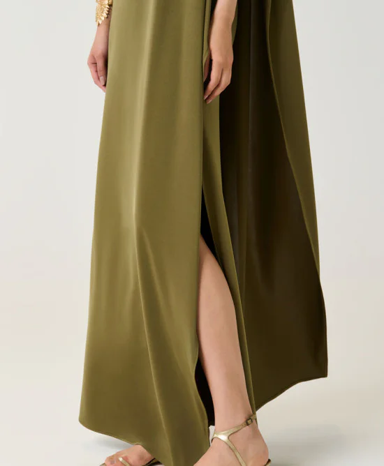 Η μεταλλική λεπτομέρεια στον ώμο σε συνδυασμό με τις σούρες προσθέτουν glam χαρακτήρα και αναβαθμίζουν το συνολικό αποτέλεσμα. Το σκίσιμο στο πλάι χαρίζει θηλυκότητα και ελευθερία κινήσεων.