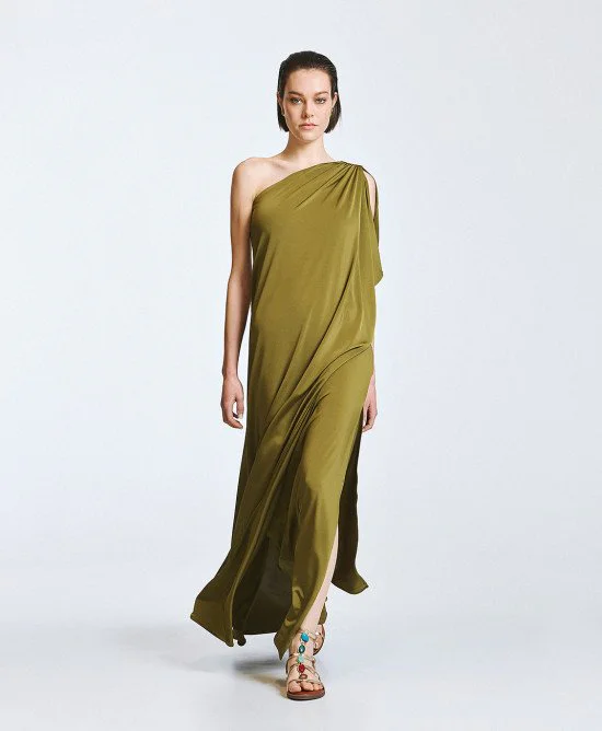 Το ACCESS One-Shoulder Dress with Metallic Detail είναι ένα εντυπωσιακό μάξι φόρεμα που αποπνέει κομψότητα και δυναμισμό. Ο asymmetric σχεδιασμός με έναν ώμο αναδεικνύει τη σιλουέτα, ενώ η ενσωματωμένη ντραπέ λεπτομέρεια τύπου κάπας αγκαλιάζει τον ώμο και ρέει μέχρι το τελείωμα, δημιουργώντας αέρινη κίνηση.