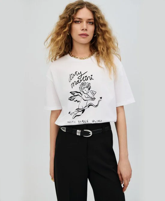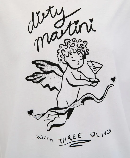 Κατασκευασμένο από 100% βαμβάκι, χαρίζει φυσική αίσθηση και σταθερή εφαρμογή. Το μπροστινό τύπωμα “Dirty Martini” συνδυάζεται με διακριτικές στρας λεπτομέρειες που προσθέτουν glam πινελιά στο σύνολο.