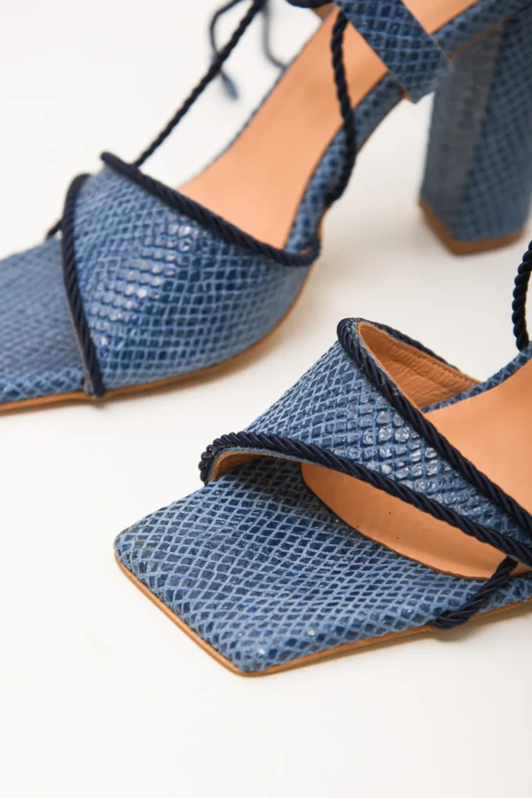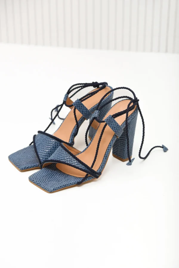 Τα τακούνια Callaloo είναι τολμηρά και εύκολα στη χρήση. Διαθέτουν μια τετράγωνη μύτη, χοντρό ψηλό τακούνι και στριμμένους ιμάντες σχοινιού που τυλίγονται γύρω από τον αστράγαλο για μια ασφαλή, κομψή εφαρμογή. Η ψεύτικη υφή από δέρμα φιδιού τα κάνει να ξεχωρίζουν. Διατίθεται σε μπεζ και μπλε, είναι τέλεια για την ημέρα ή τη νυχτερινή εμφάνιση.