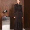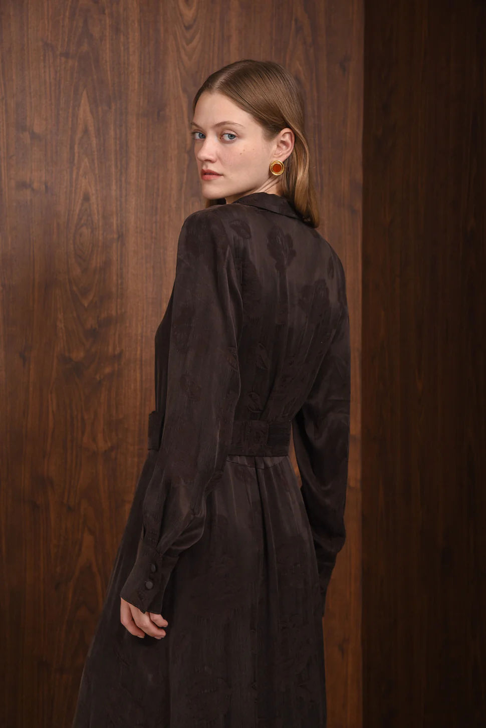 Η ARPYES Inner Voice Dress Brown είναι ένα maxi φόρεμα που συνδυάζει κομψότητα και άνεση. Κατασκευασμένο από floral jacquard ύφασμα, διαθέτει pointed γιακά, κουμπωτό μπροστινό μέρος, μακριά μανίκια με κουμπί στα τελειώματα, και ζώνη στη μέση για να τονίζει τη σιλουέτα.