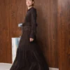 Η μακριά φούστα φτάνει μέχρι το πάτωμα, ολοκληρώνοντας το φόρεμα με απαλή, ρέουσα λεπτομέρεια βολάν, που προσφέρει κίνηση και θηλυκότητα σε κάθε βήμα. Ιδανικό για επίσημες ή ιδιαίτερες εμφανίσεις, αλλά και για all-day κομψότητα.