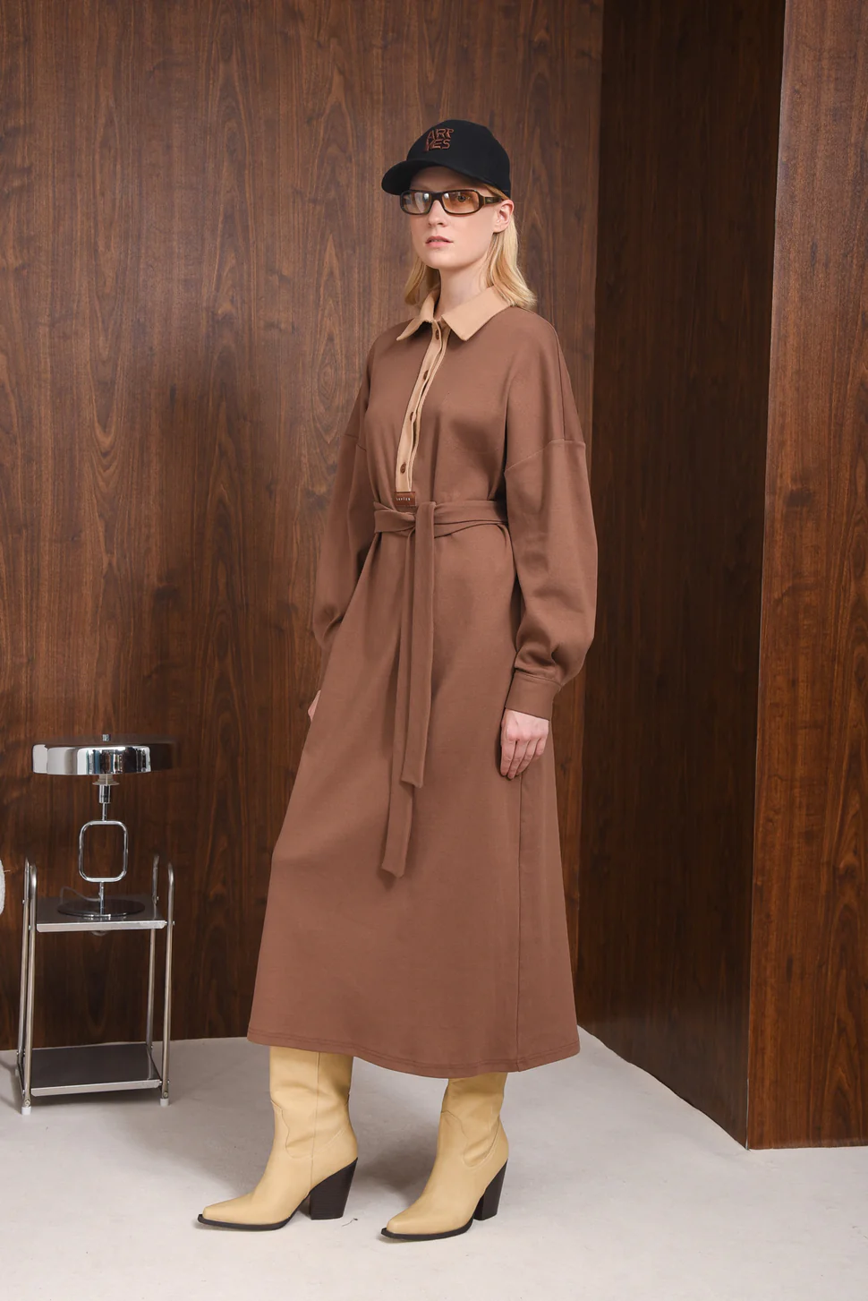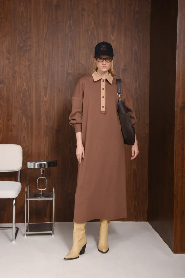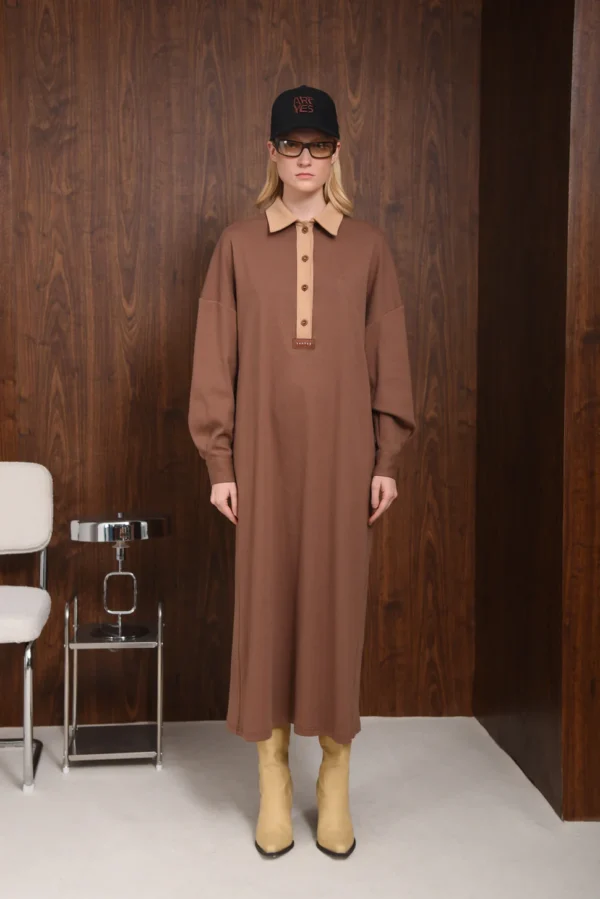 Το ARPYES Real Dress Brown αποπνέει διαχρονική κομψότητα μέσα από το minimal design και τη γήινη του απόχρωση. Ο μπεζ γιακάς και η αντίθεση στην πατιλέτα δίνουν μοντέρνα πινελιά, ενώ η αποσπώμενη ζώνη αναδεικνύει τη μέση για μια θηλυκή σιλουέτα.