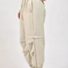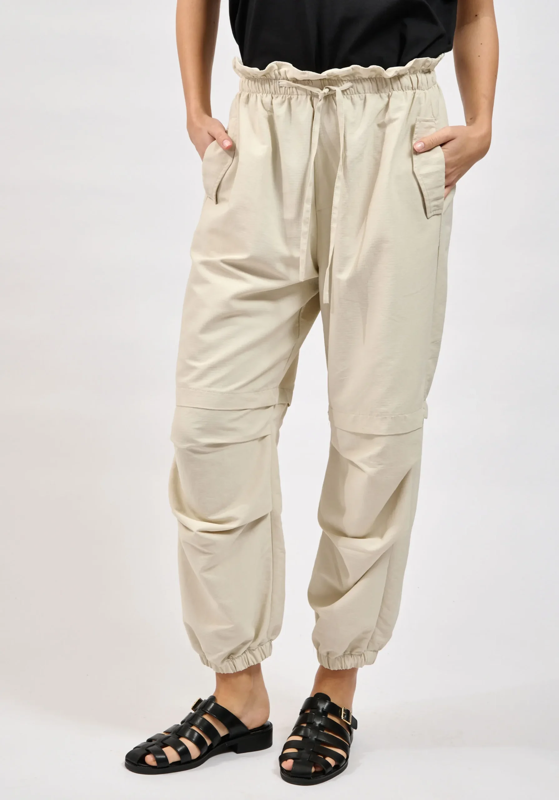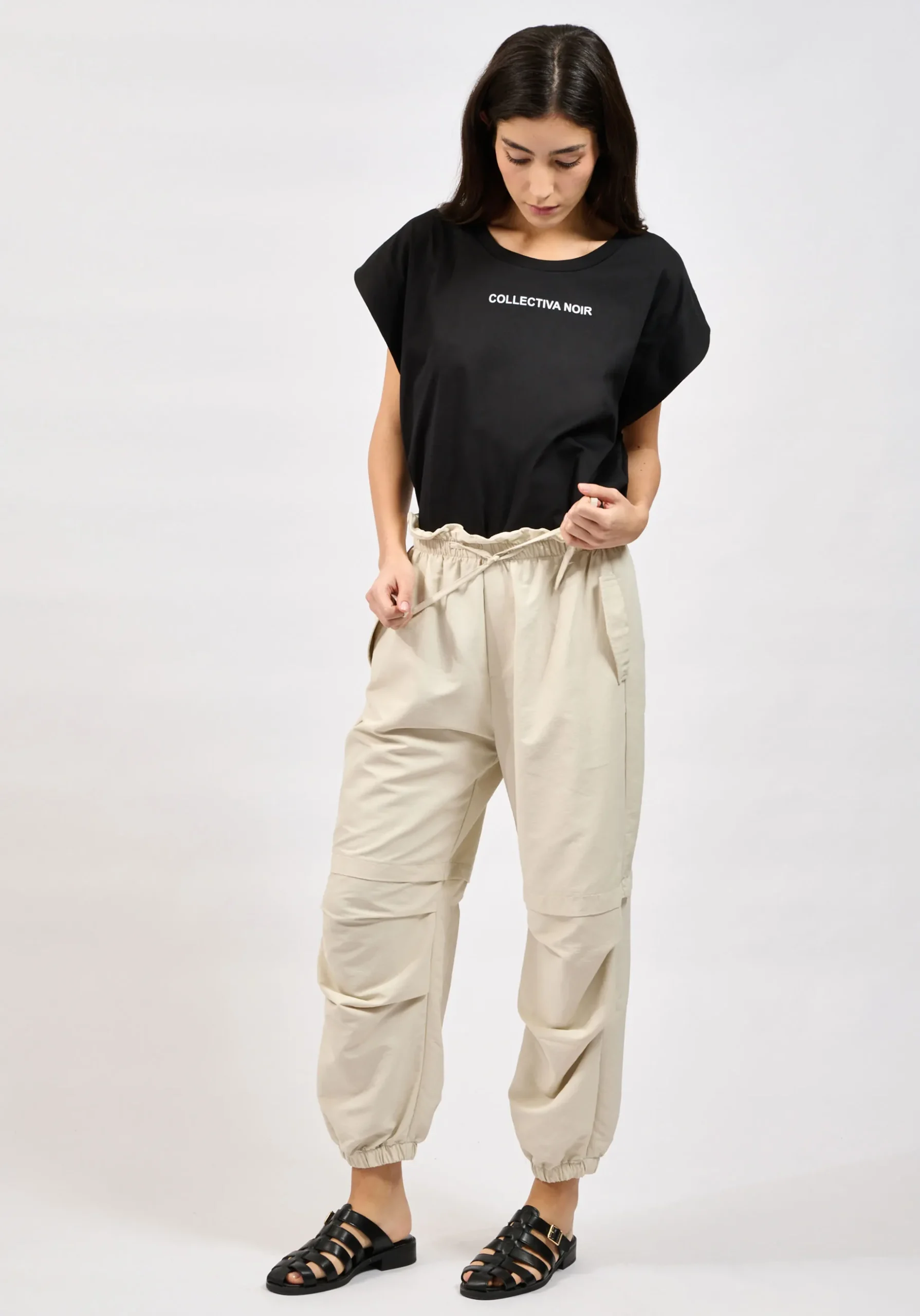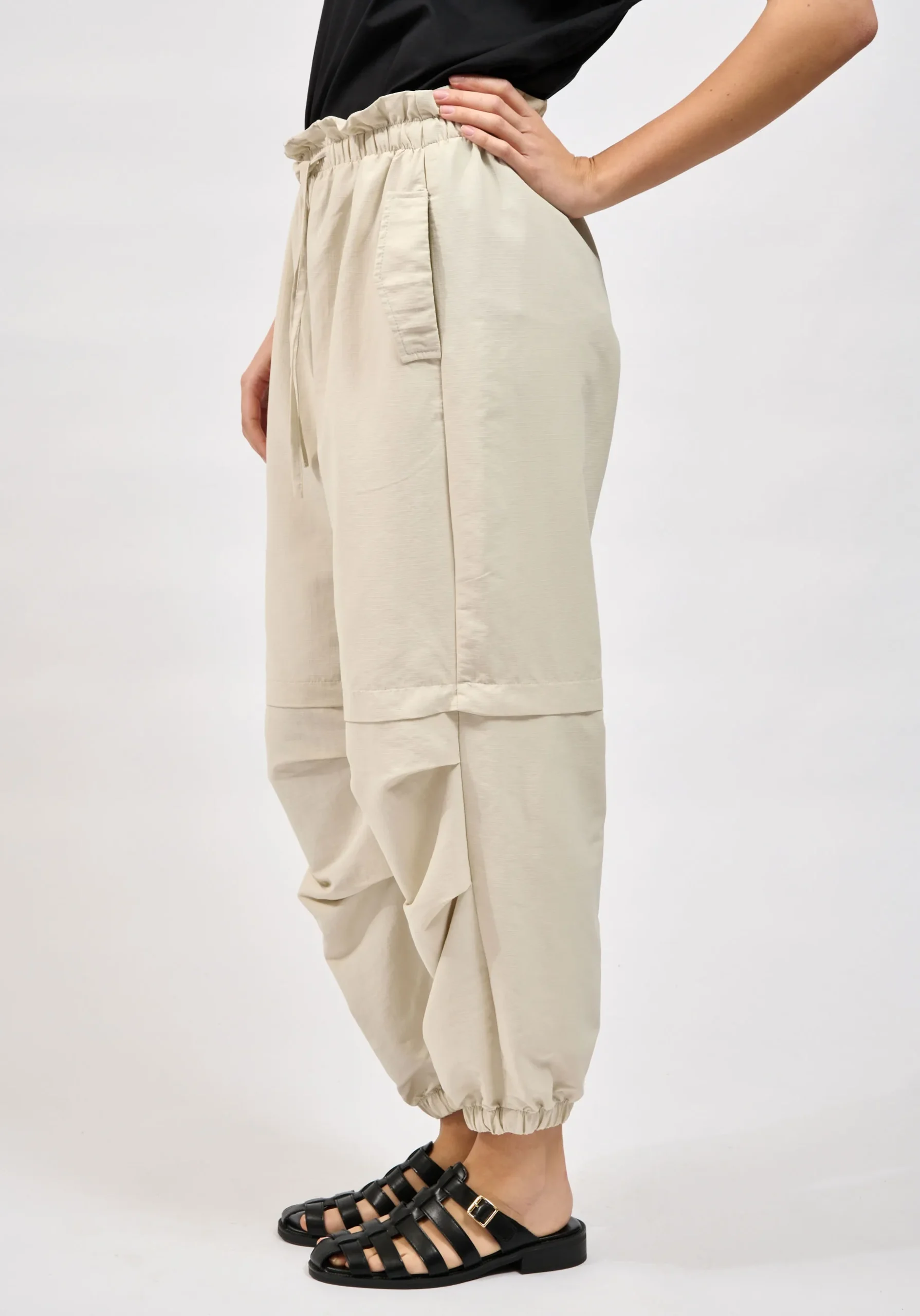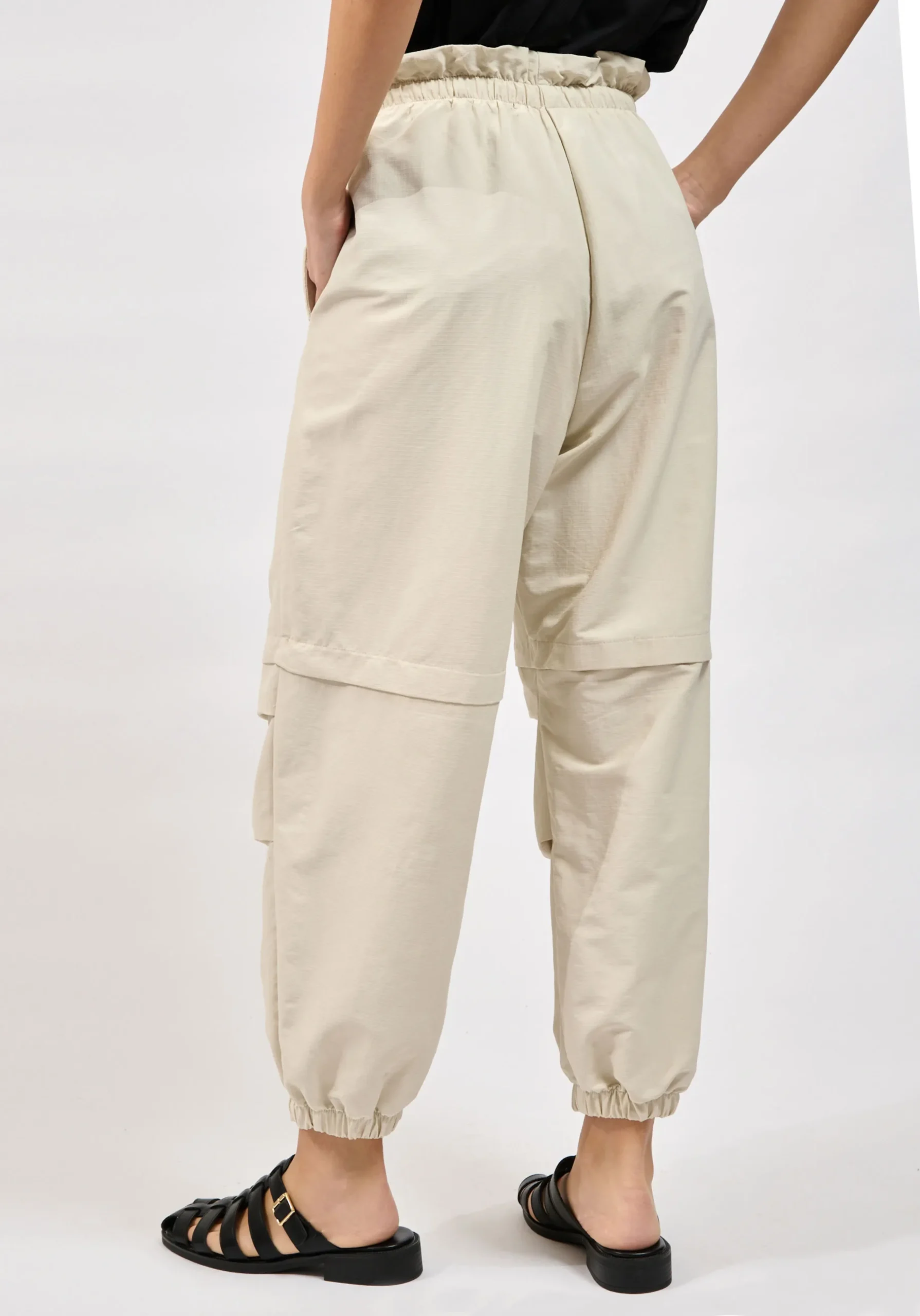 Το παντελόνι διαθέτει mid έως high rise εφαρμογή και ελαστική ζώνη μέσης με ρυθμιζόμενο κορδόνι, προσφέροντας άνετη και σταθερή εφαρμογή στο σώμα. Οι utility cargo τσέπες προσθέτουν πρακτικότητα και ενισχύουν το σύγχρονο urban ύφος του ρούχου.