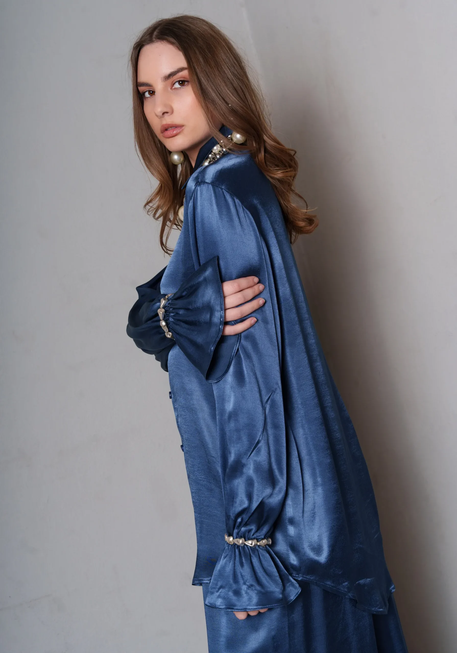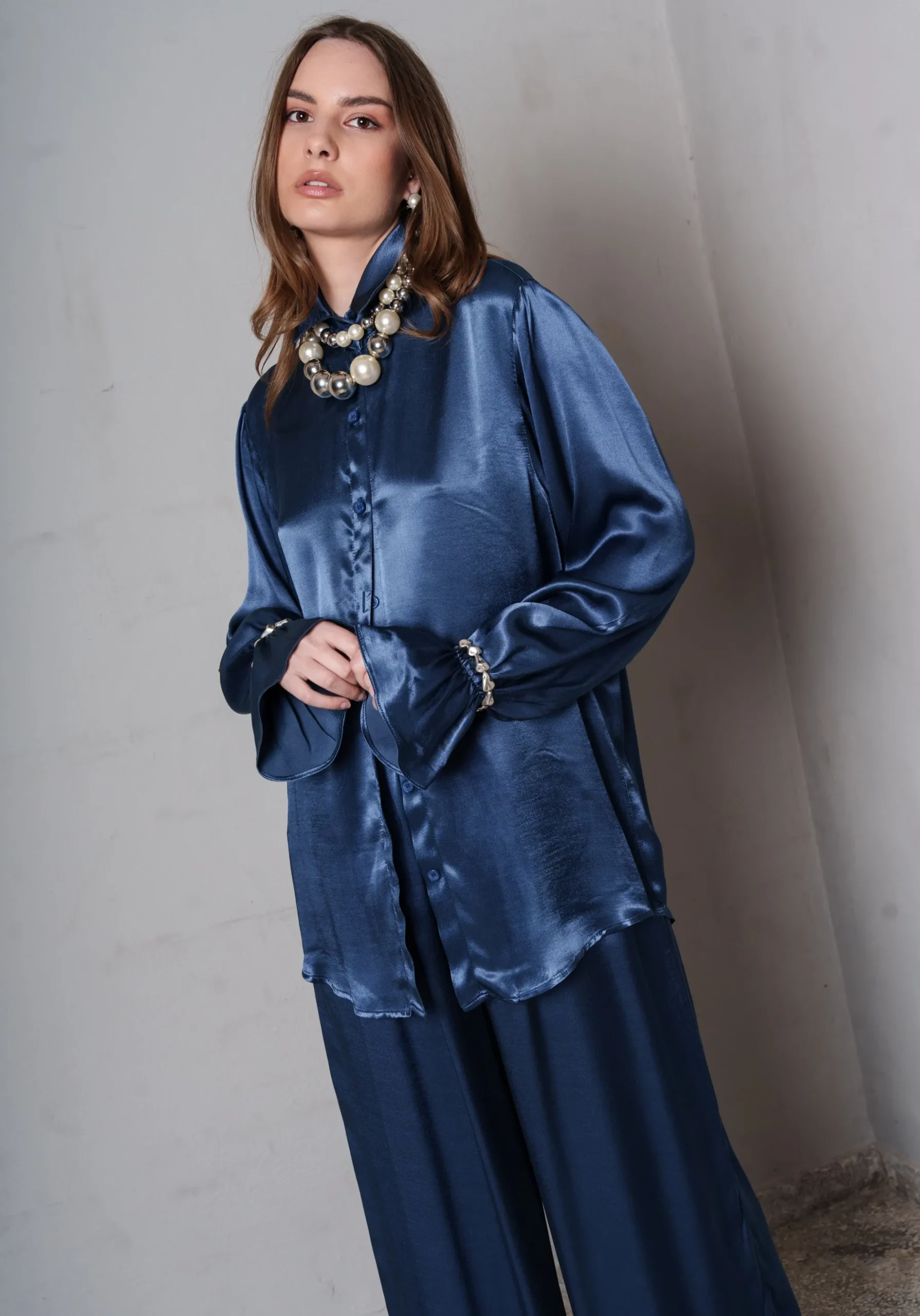 COLLECTIVA Noir Calli Shirt: σατέν πουκαμίσα με trumpet μανίκια, ασύμμετρο σχέδιο και μεταξωτή υφή. Elegant επιλογή για all-day looks.