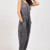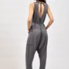 Το jumpsuit διαθέτει μπροστινές patch τσέπες, προσθέτοντας πρακτικότητα αλλά και σύγχρονη αισθητική. Η ανοιχτή πλάτη με δέσιμο δημιουργεί ένα ιδιαίτερο design στοιχείο που κάνει το ρούχο να ξεχωρίζει.