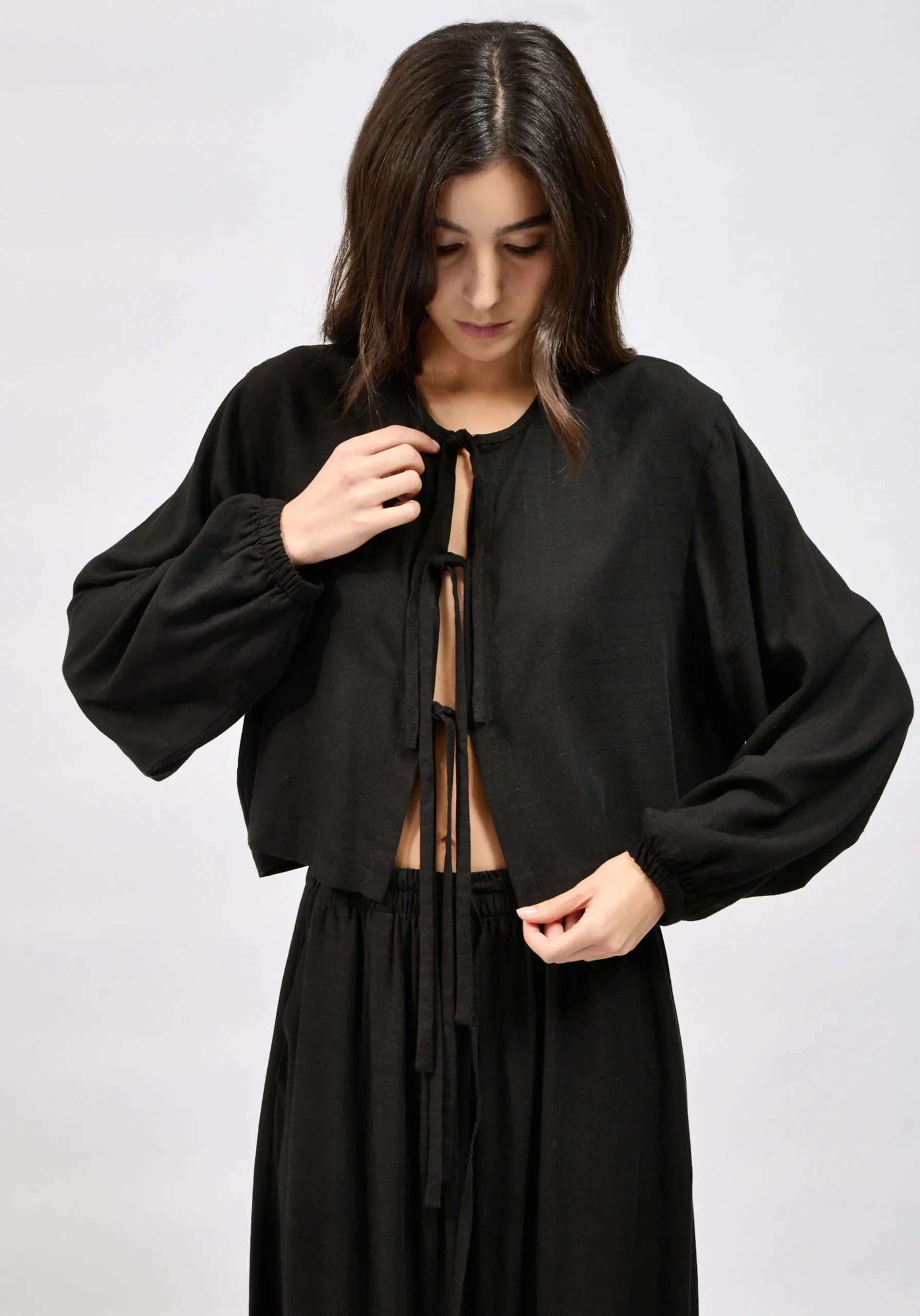 Το Collectiva Noir Hearth Shirt είναι ένα κομψό και αέρινο γυναικείο πουκάμισο με loose εφαρμογή και ιδιαίτερο σχεδιασμό. Διαθέτει μακριά μανίκια, διακριτικά cut out στοιχεία και κορδόνια που δένουν σε τρία σημεία για μοναδικό styling. Κατασκευασμένο από ύφασμα με λινό και rayon για δροσερή και άνετη αίσθηση. Designed in Athens και Made in Greece.