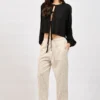 Το σχέδιο θυμίζει ελαφρύ shirt-style top, καθώς διαθέτει κουμπιά μέχρι το midsection, που κλείνουν σε στρογγυλή λαιμόκοψη, προσφέροντας καθαρή και minimal αισθητική. Τα μακριά και φαρδιά μανίκια που φτάνουν λίγο κάτω από τον αγκώνα προσθέτουν άνεση και χαλαρό χαρακτήρα στο ρούχο.