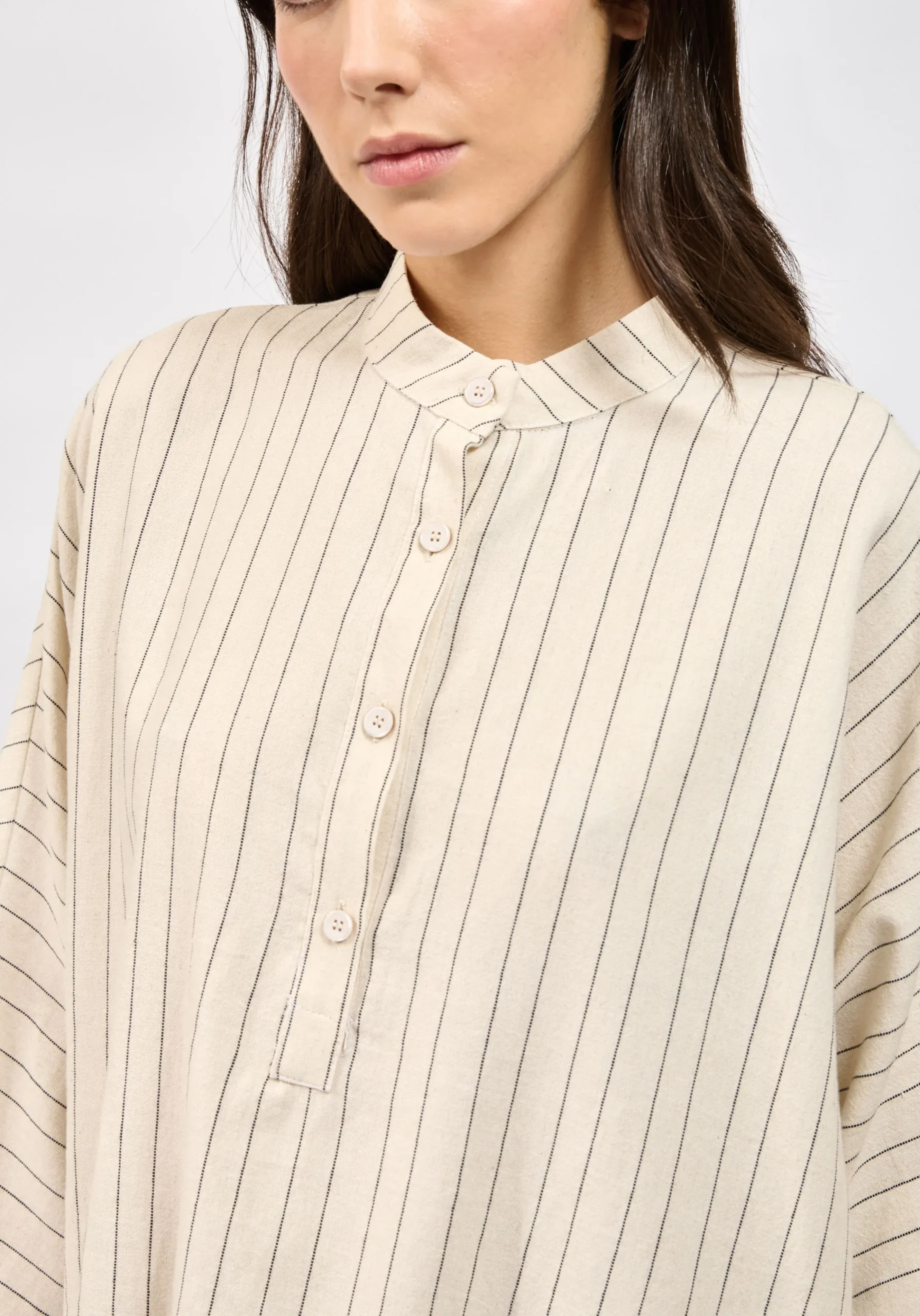 Το σχέδιο θυμίζει ελαφρύ shirt-style top, καθώς διαθέτει κουμπιά μέχρι το midsection, που κλείνουν σε στρογγυλή λαιμόκοψη, προσφέροντας καθαρή και minimal αισθητική. Τα μακριά και φαρδιά μανίκια που φτάνουν λίγο κάτω από τον αγκώνα προσθέτουν άνεση και χαλαρό χαρακτήρα στο ρούχο.