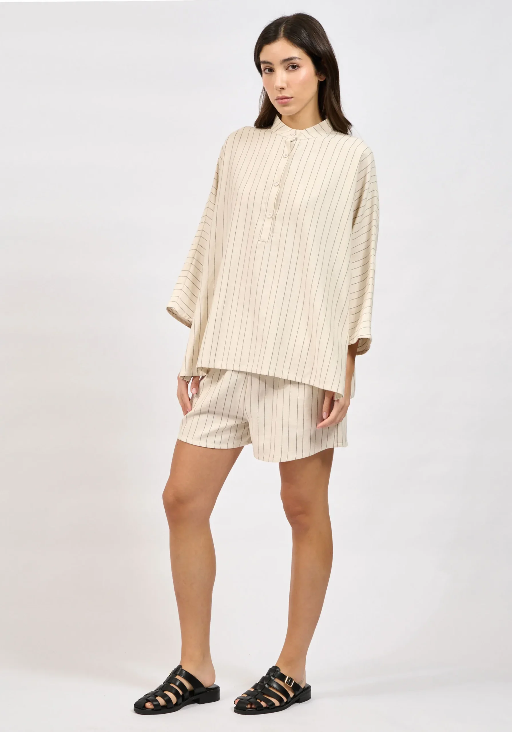 Οι λεπτές κάθετες ρίγες δίνουν διακριτική κομψότητα και επιμηκύνουν οπτικά τη σιλουέτα, ενώ το 100% βαμβακερό ύφασμα εξασφαλίζει φυσική αίσθηση, διαπνοή και άνεση καθ’ όλη τη διάρκεια της ημέρας.