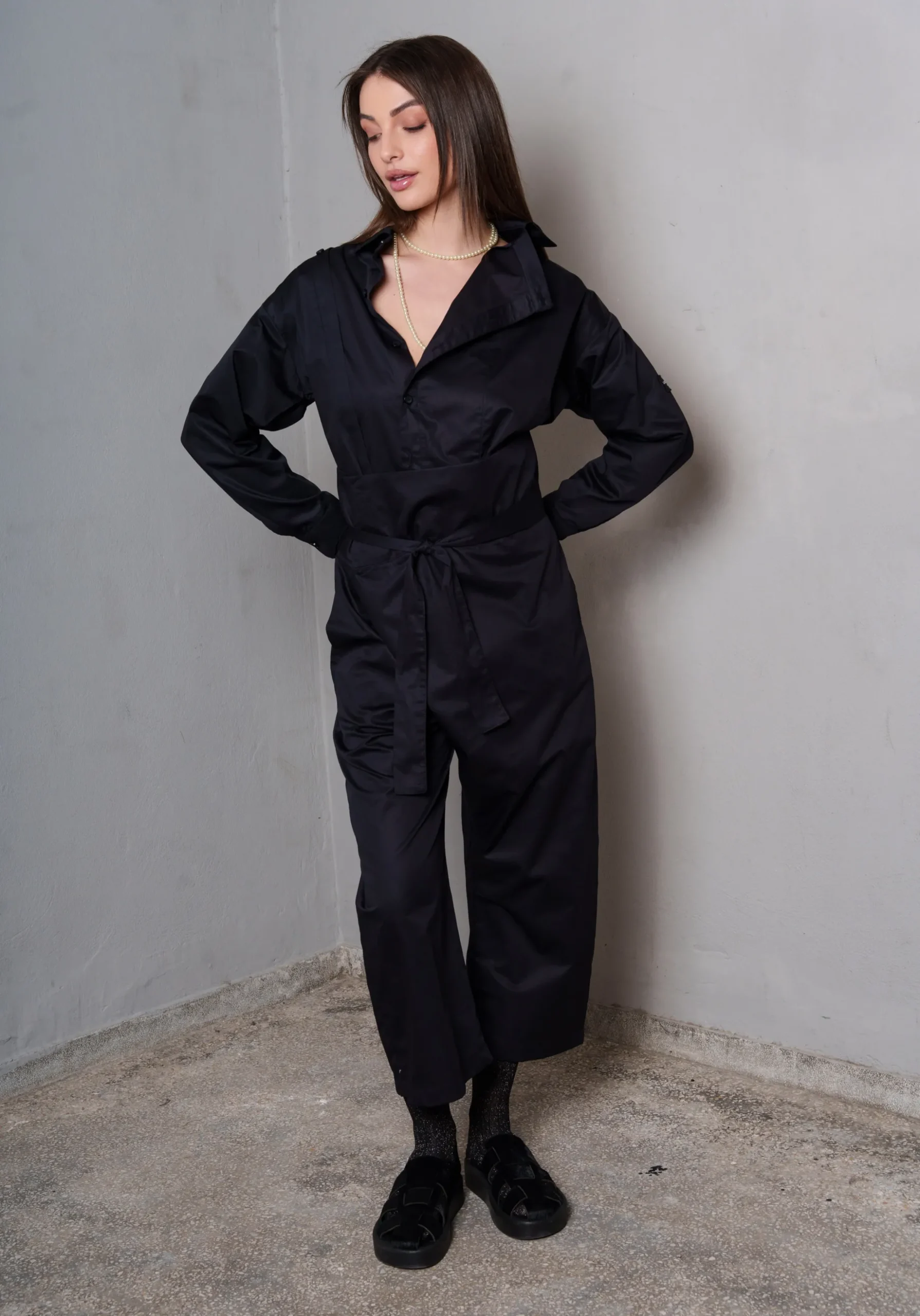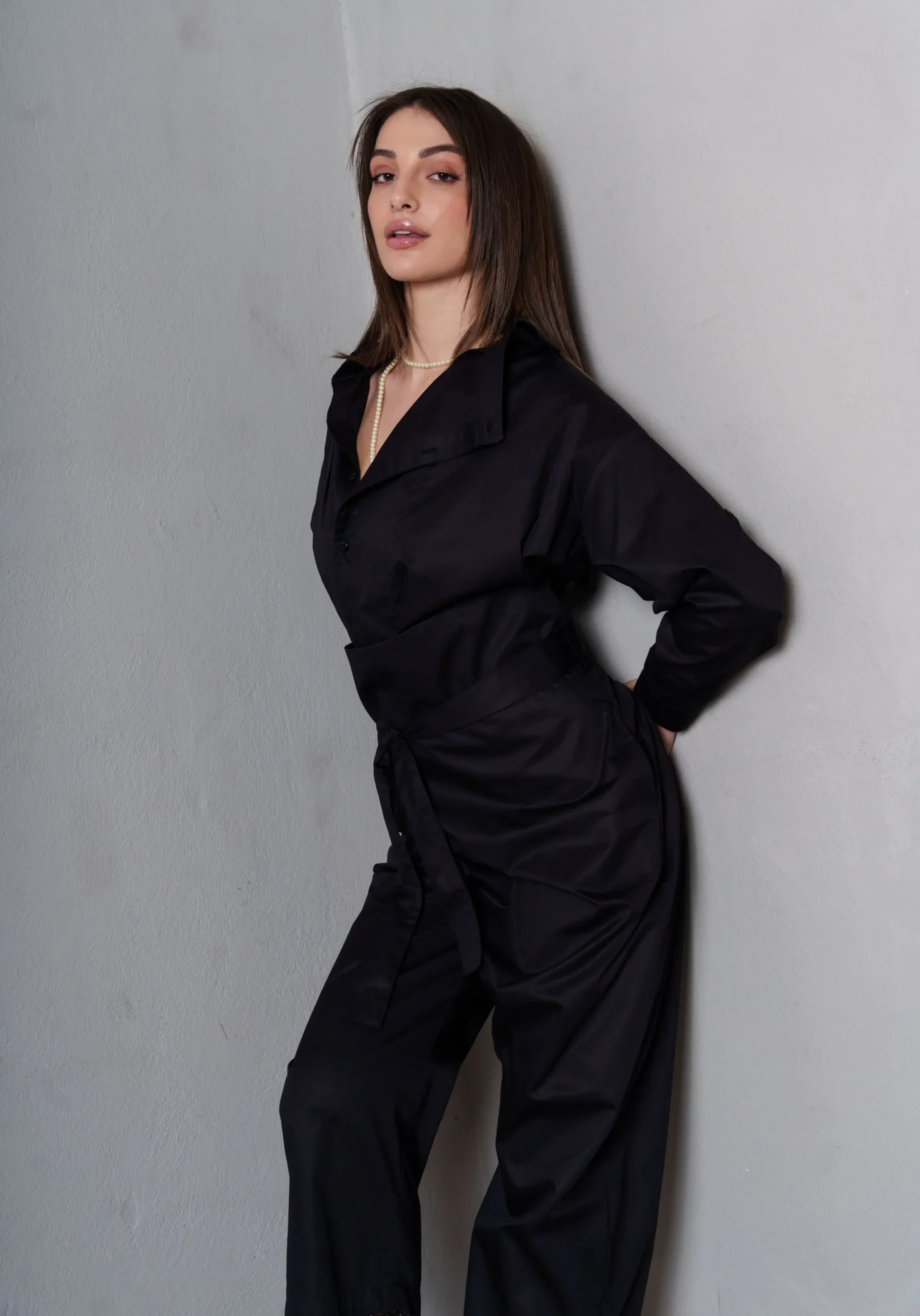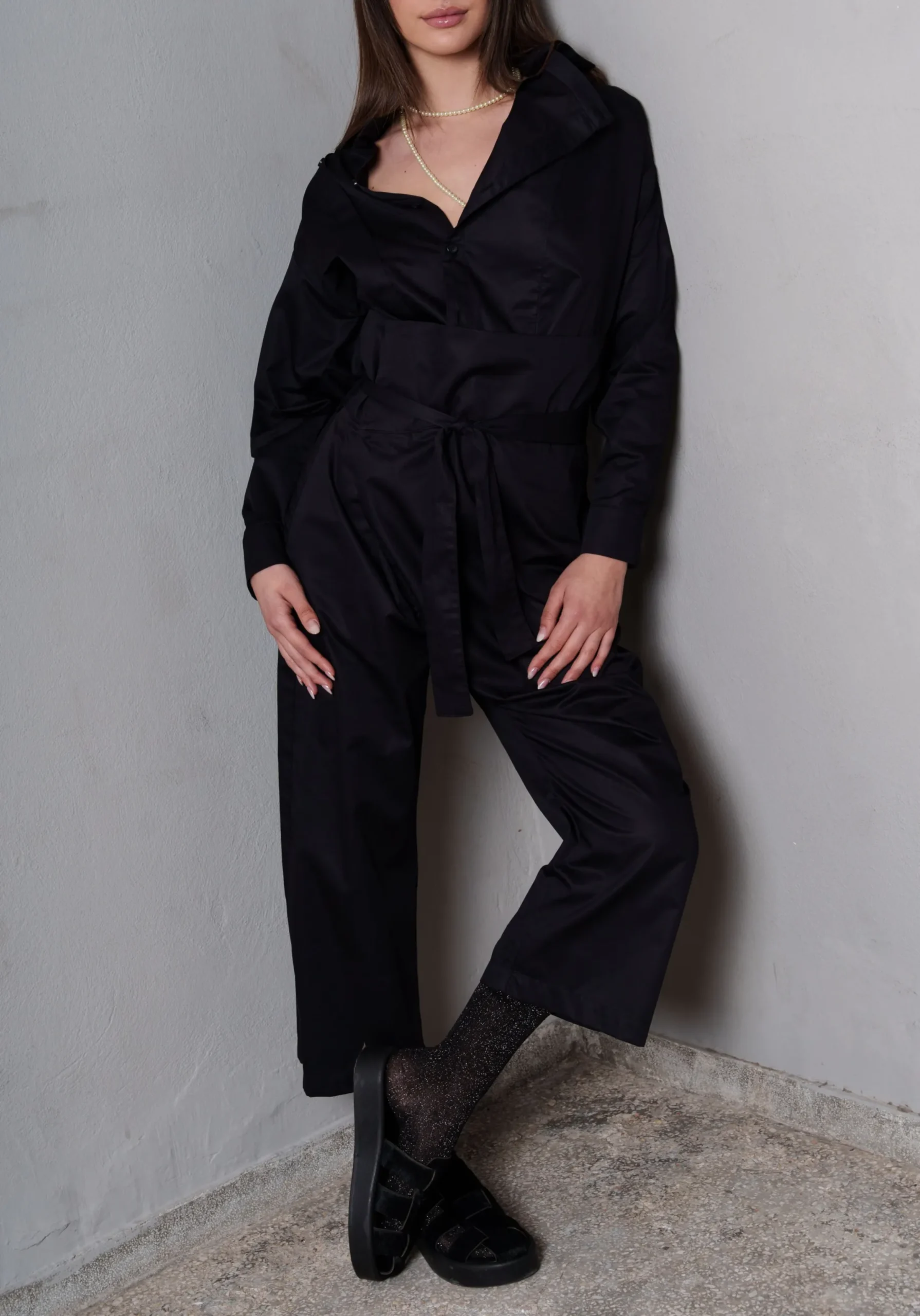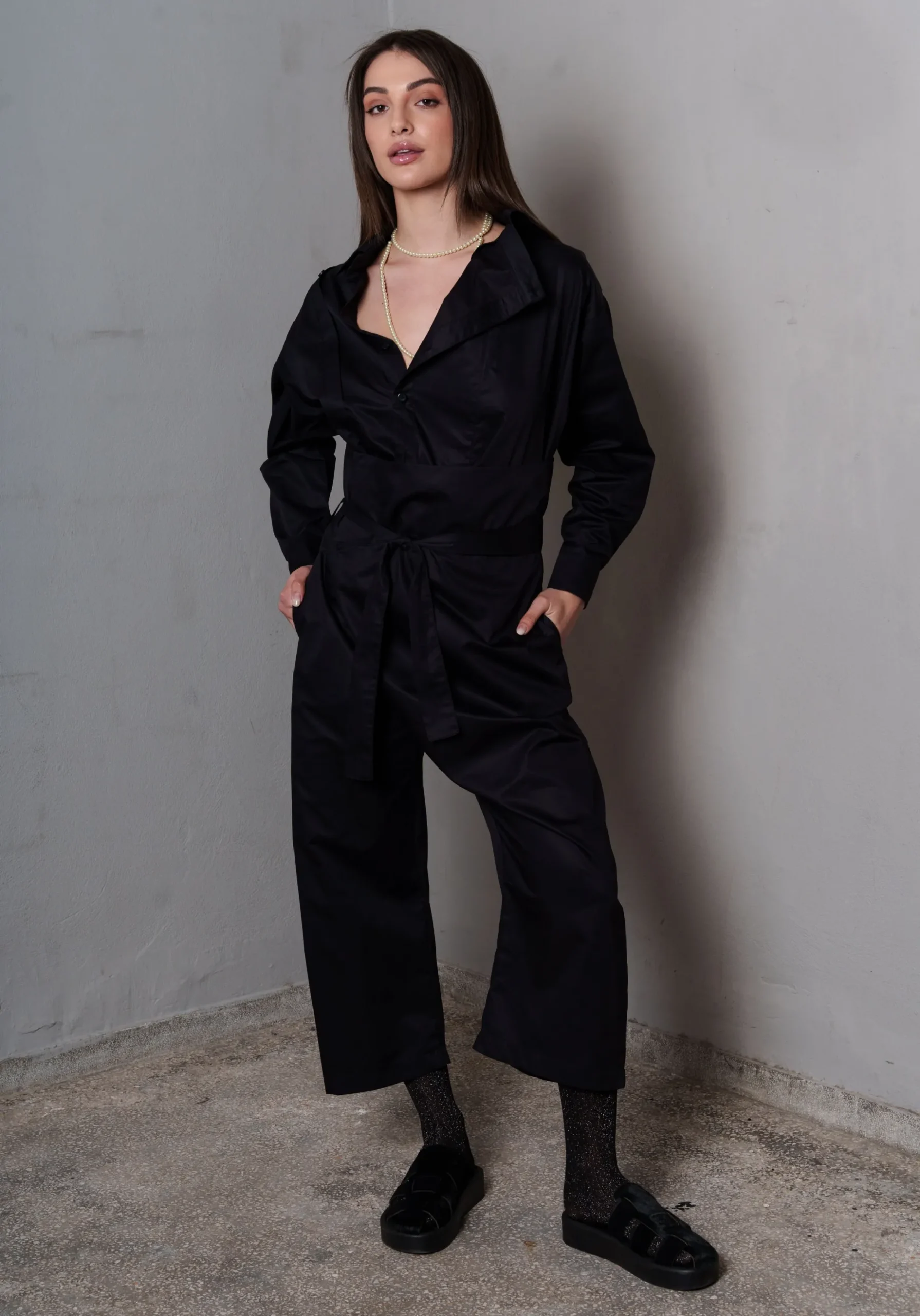 Το COLLECTIVA NOIR Myrsy Pants Black αποτελεί ένα μοναδικό κομμάτι με έμπνευση από την ιαπωνική γραμμή, κατασκευασμένο από πολυτελή silky ποπλίνα. Η υφή του προσφέρει απαλότητα και κομψότητα, ενώ η ζώνη από το ίδιο ύφασμα και η μπάσκα εξασφαλίζουν άνετη αλλά και σταθερή εφαρμογή.