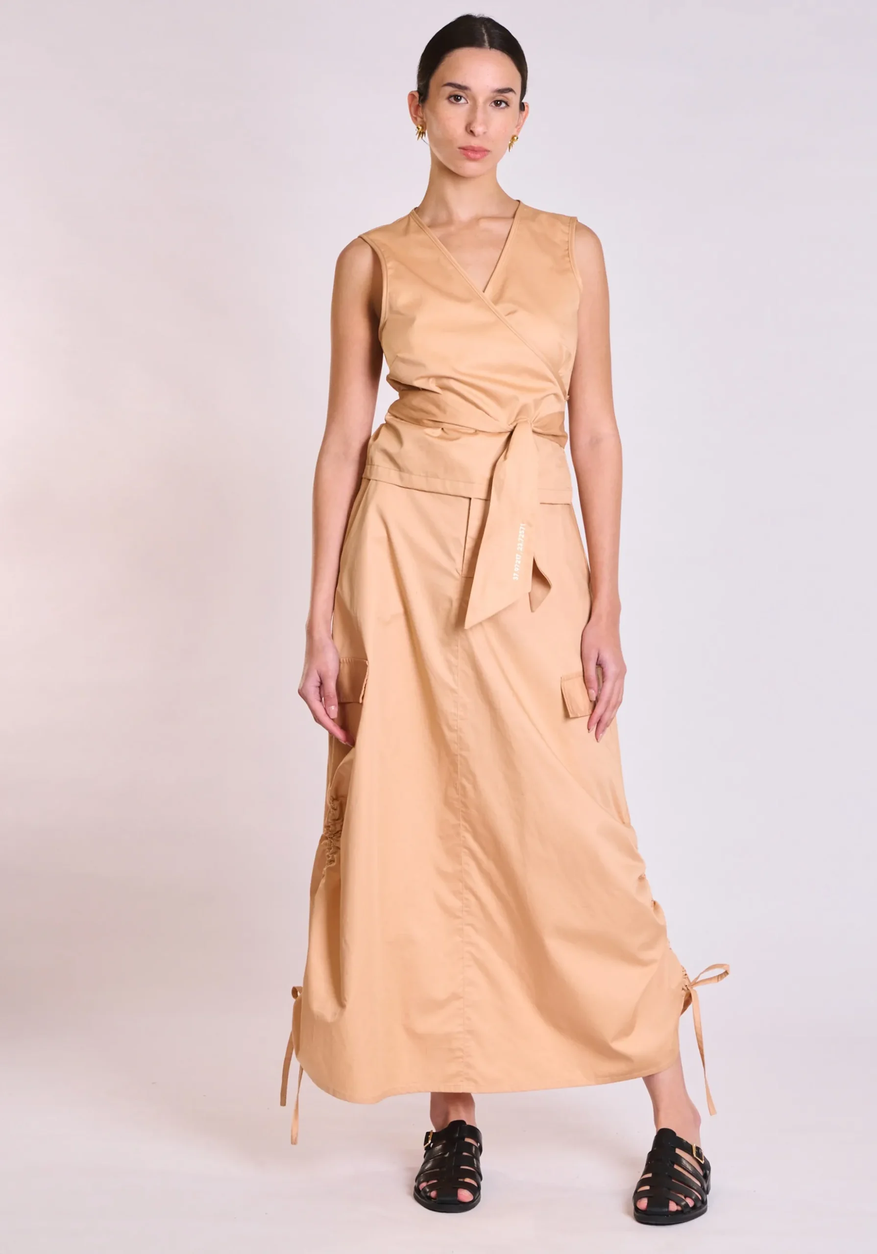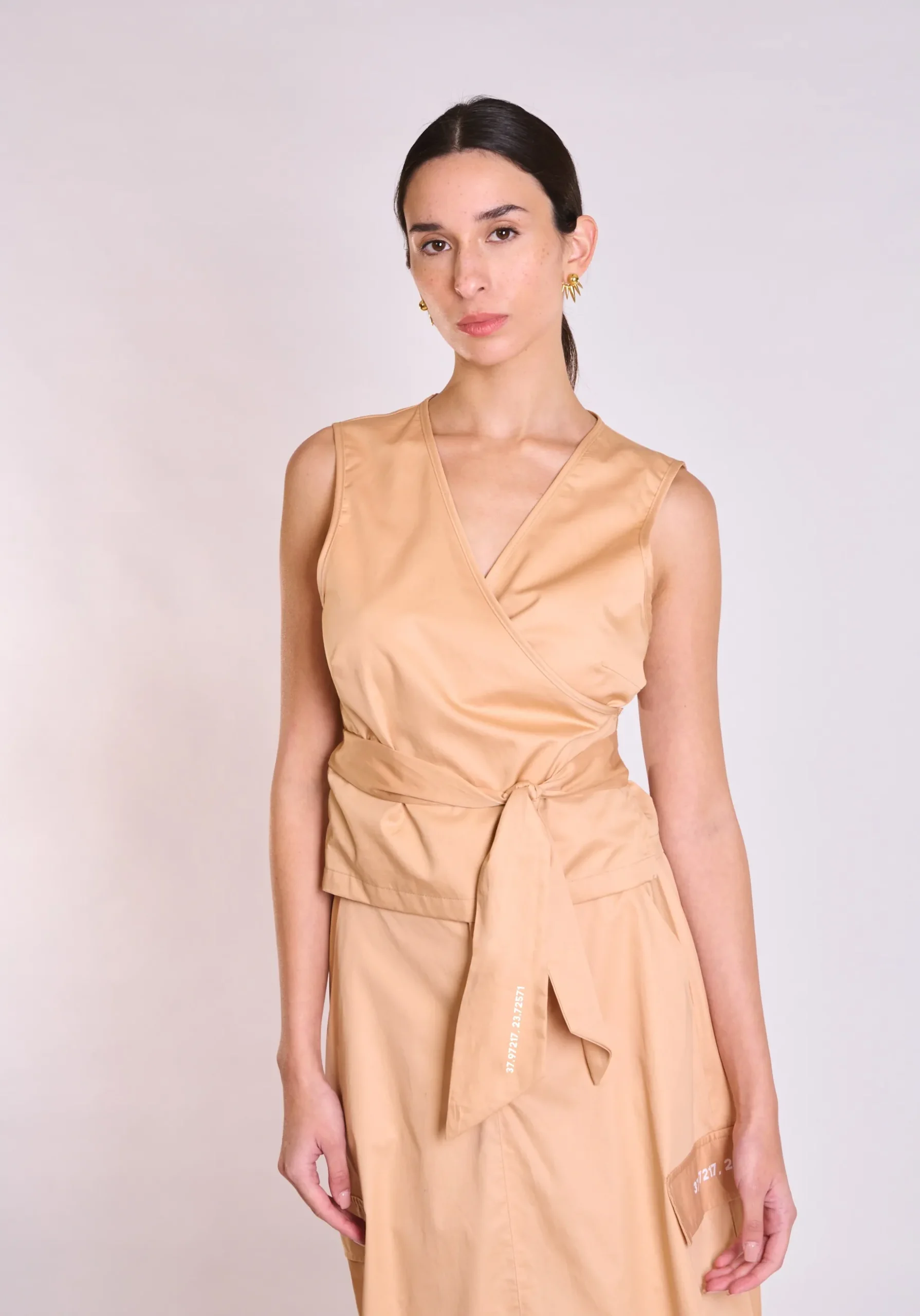 Το top διαθέτει ρυθμιζόμενο δέσιμο στη μέση, επιτρέποντας προσαρμογή της εφαρμογής ανάλογα με το στυλ και το σώμα. Αυτή η λεπτομέρεια προσφέρει άνεση αλλά και δυνατότητα να δημιουργηθεί πιο fitted ή πιο relaxed αποτέλεσμα.