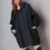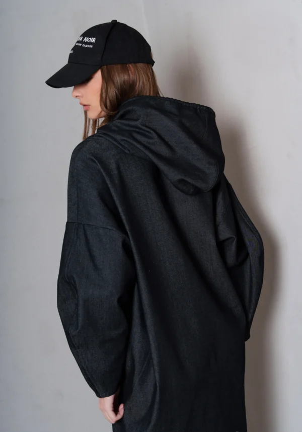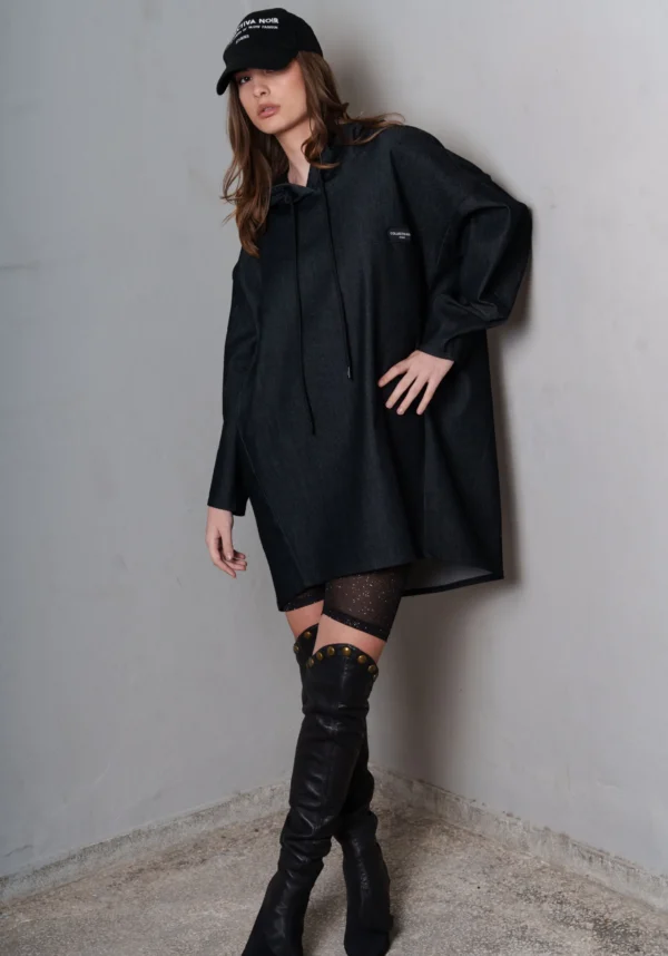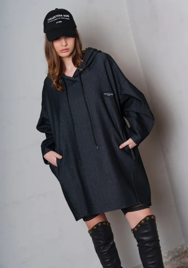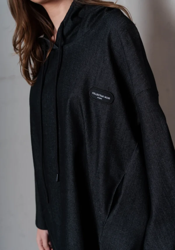 Το COLLECTIVA Noir Paco Dress είναι ένα σχεδιαστικό denim φόρεμα που ξεχωρίζει για τον urban χαρακτήρα του και την άνετη εφαρμογή του. Διαθέτει έντονα flare μανίκια, πλαϊνές τσέπες και κουκούλα με κορδόνια, δίνοντας μια μοντέρνα και ταυτόχρονα πρακτική αισθητική. Το patch με το λογότυπο CN προσθέτει μια διακριτική signature λεπτομέρεια.