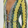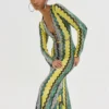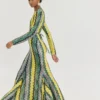 Κατασκευασμένο από πλεκτό ύφασμα με χρυσοκλωστή, το φόρεμα δημιουργεί διακριτική λάμψη, ιδανική για βραδινές εμφανίσεις ή ιδιαίτερες περιστάσεις. Τα μακριά flare μανίκια ολοκληρώνουν το statement look, προσθέτοντας drape και κίνηση.