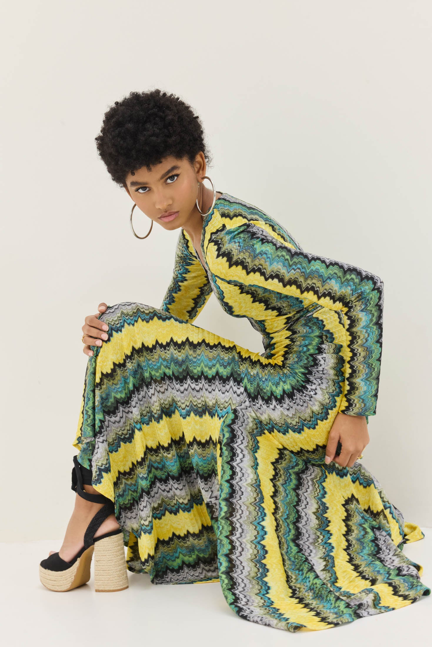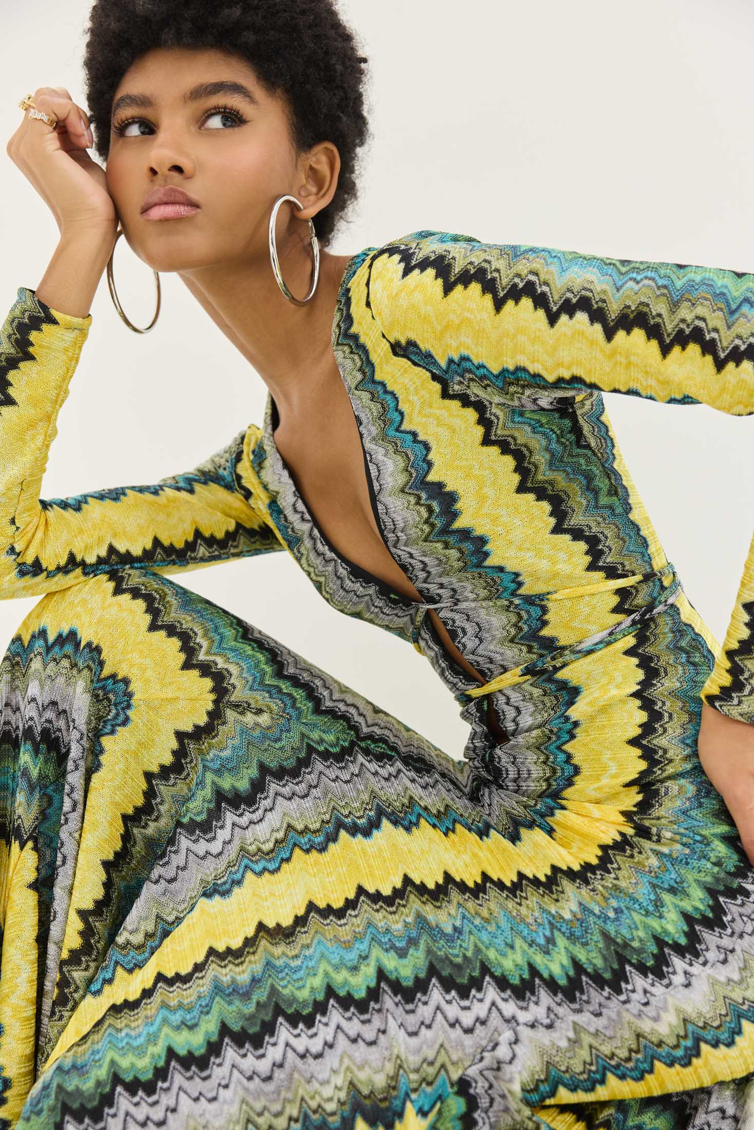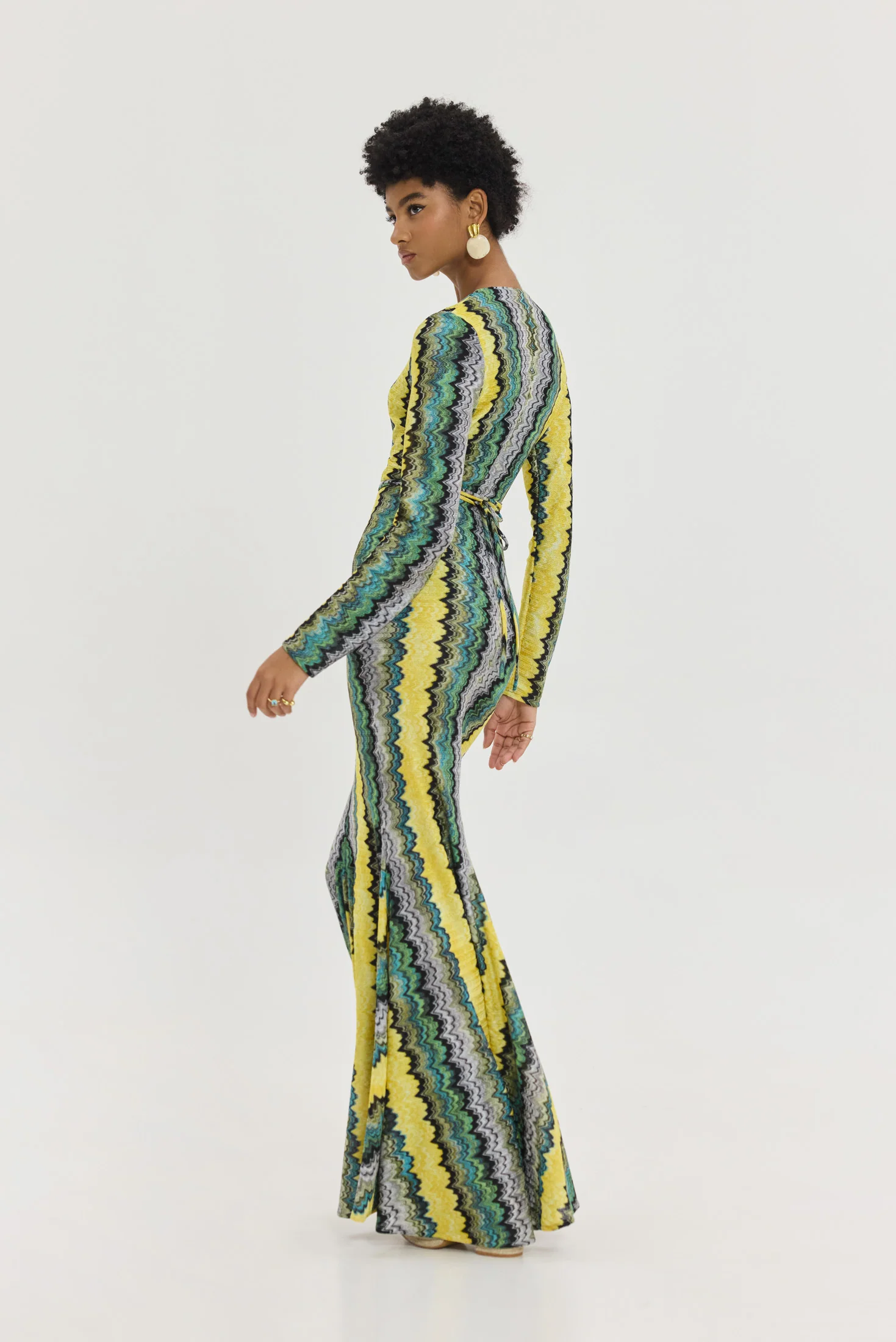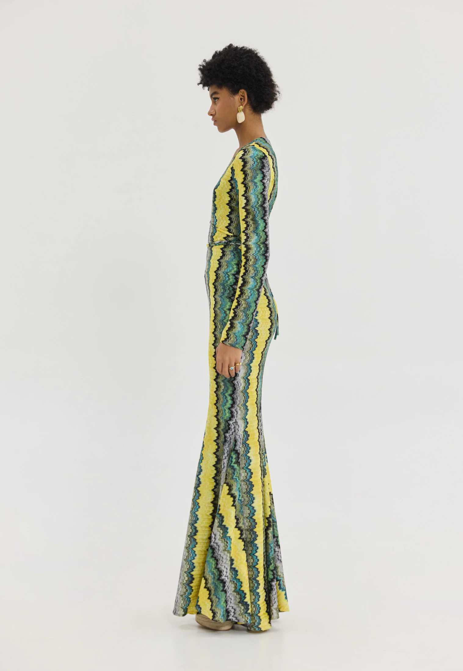 Κατασκευασμένο από πλεκτό ύφασμα με χρυσοκλωστή, το φόρεμα δημιουργεί διακριτική λάμψη, ιδανική για βραδινές εμφανίσεις ή ιδιαίτερες περιστάσεις. Τα μακριά flare μανίκια ολοκληρώνουν το statement look, προσθέτοντας drape και κίνηση.