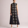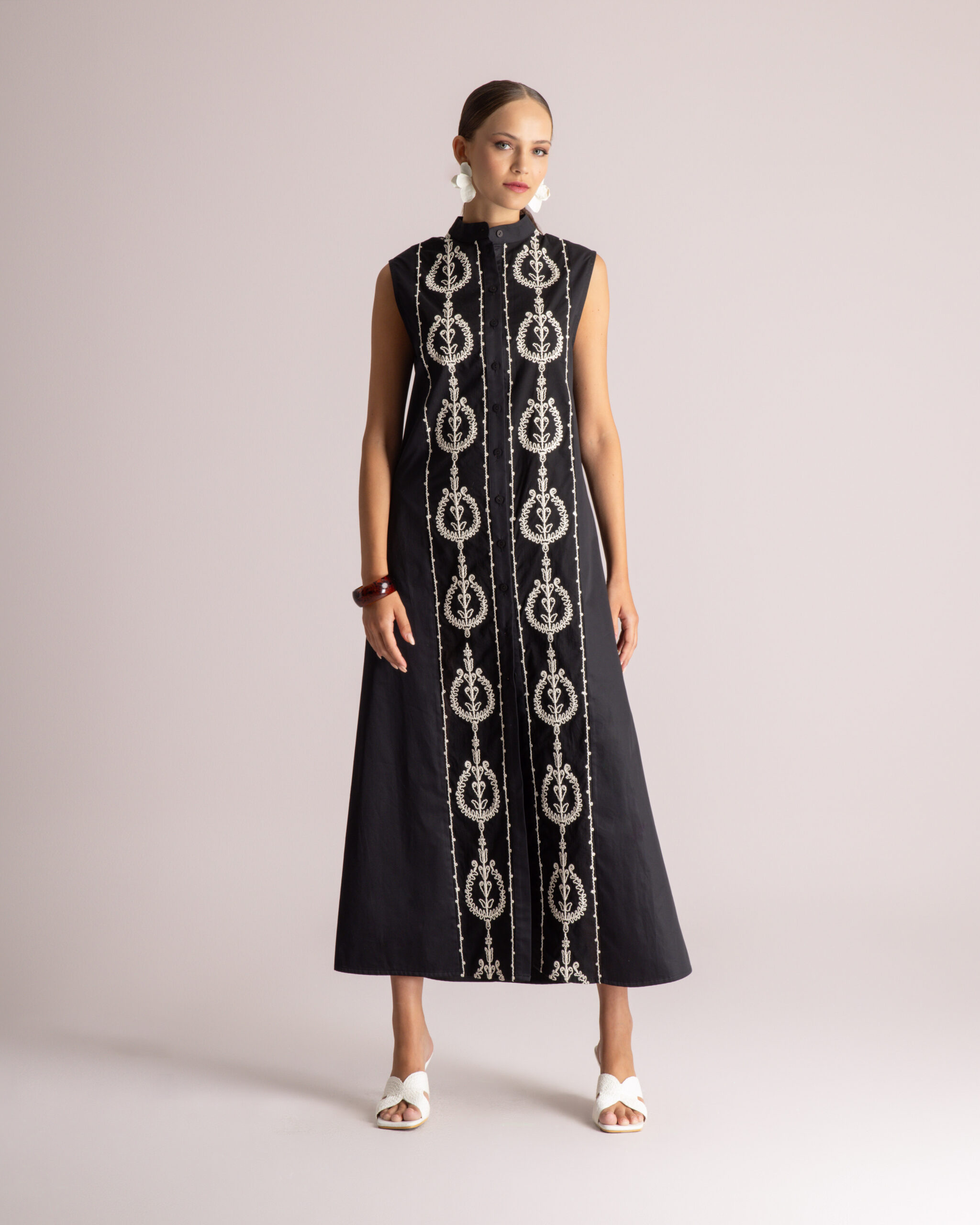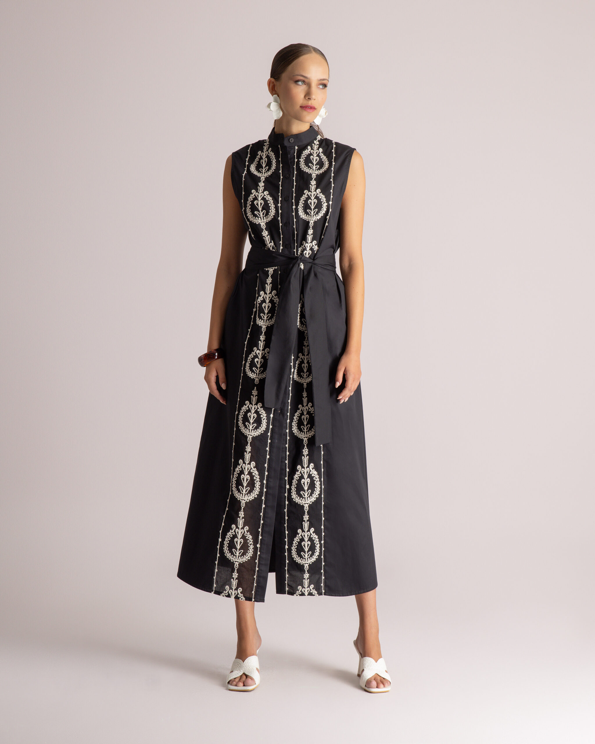 Το μαύρο χρώμα σε συνδυασμό με τα διακριτικά κεντημένα σχέδια δημιουργεί ένα κομψό και ιδιαίτερο αποτέλεσμα. Η ζώνη στη μέση αναδεικνύει τη σιλουέτα και επιτρέπει να προσαρμόσετε την εφαρμογή σύμφωνα με το στυλ σας.