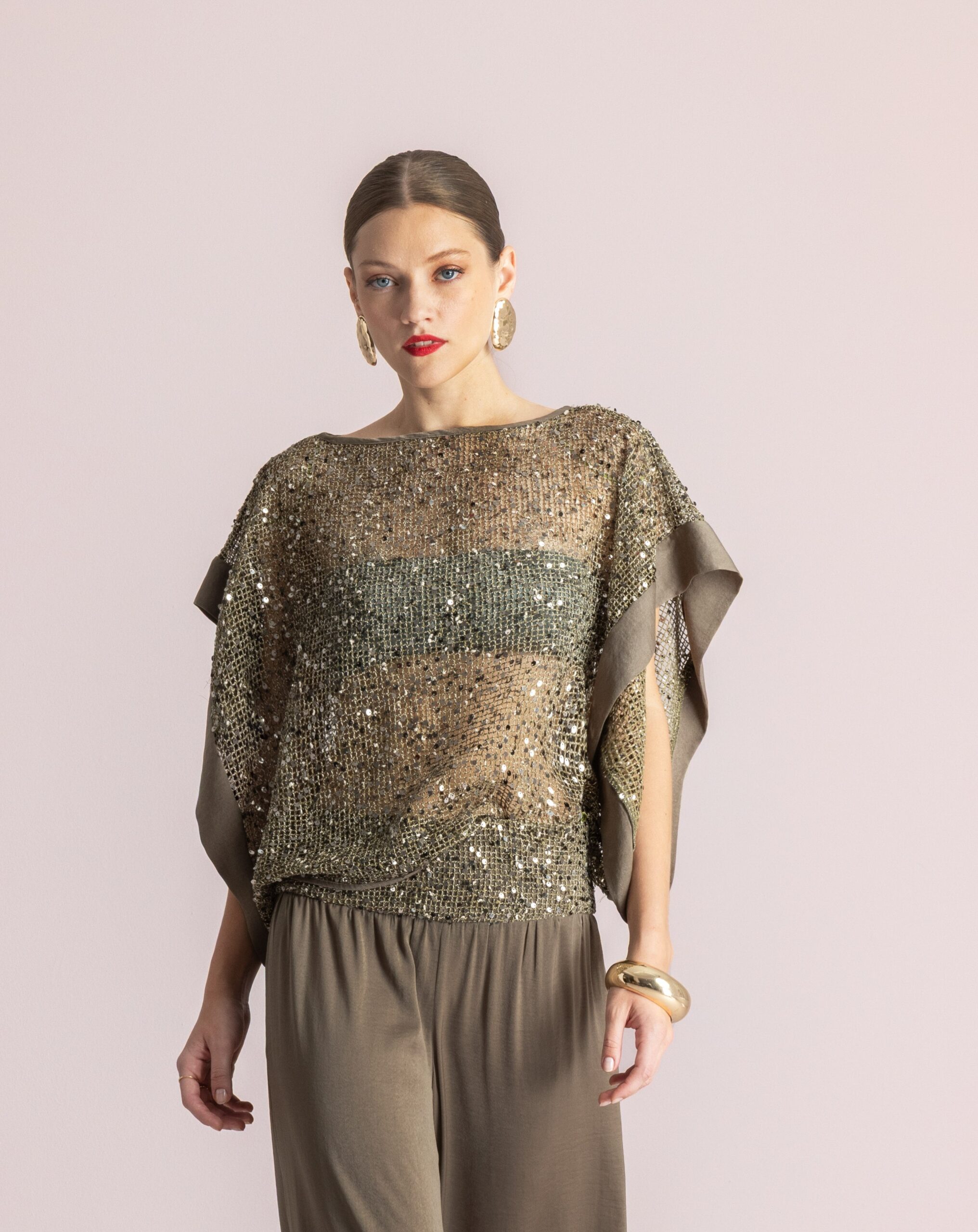 Η γραμμή της θυμίζει tunic, προσφέροντας άνεση και κομψότητα, ενώ το λαμπερό ύφασμα χαρίζει μια glamorous πινελιά στο outfit. Μπορεί να συνδυαστεί εύκολα με παντελόνια, jeans ή φούστες για ένα μοντέρνο look από το πρωί μέχρι το βράδυ.