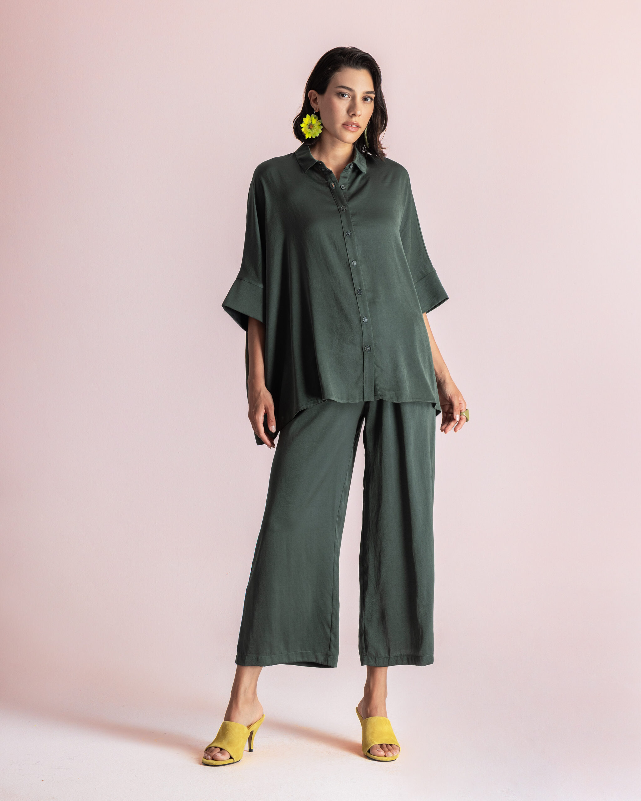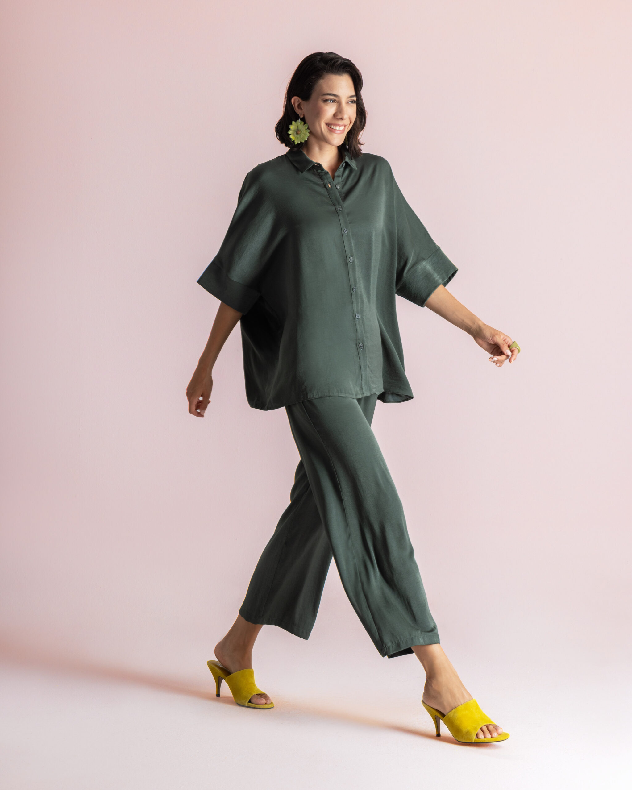 Khaki MOUTAKI Satin Shirt, κοντομάνικο oversized πουκάμισο από 100% σατέν polyester για δροσερές και μοντέρνες εμφανίσεις.