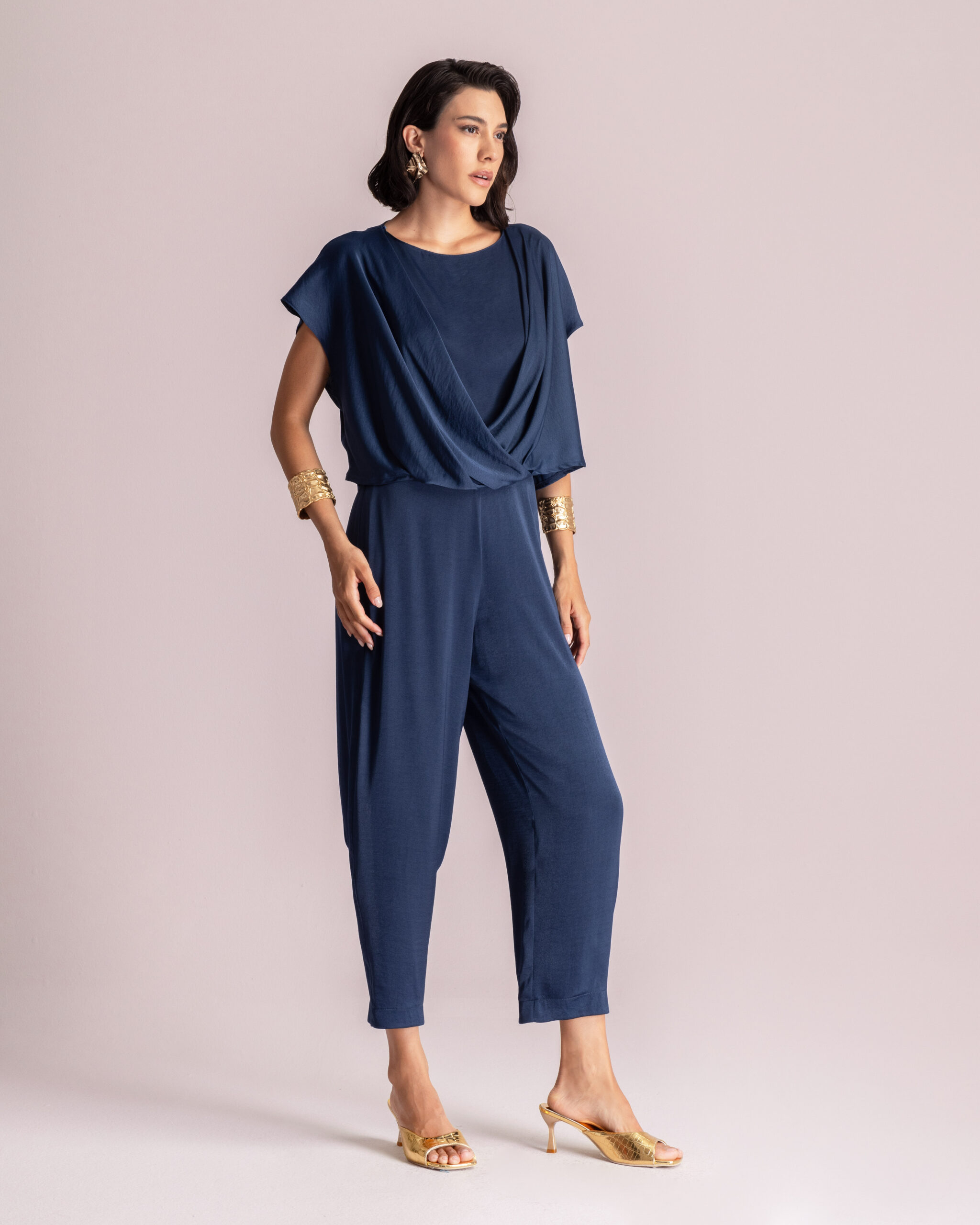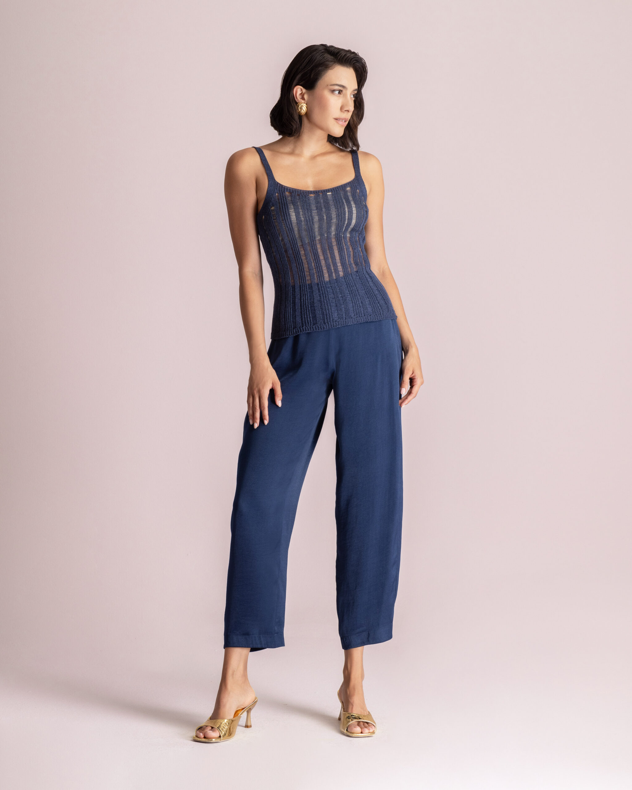 Η ελαστική μέση εξασφαλίζει τέλεια εφαρμογή, ενώ το φερμουάρ στο πλάι φτάνει μέχρι τον αστράγαλο, προσφέροντας πρακτικότητα και μοντέρνο χαρακτήρα. Το navy χρώμα και η σατέν υφή δίνουν κομψό αποτέλεσμα, ιδανικό για βραδινές εμφανίσεις ή chic casual styling.