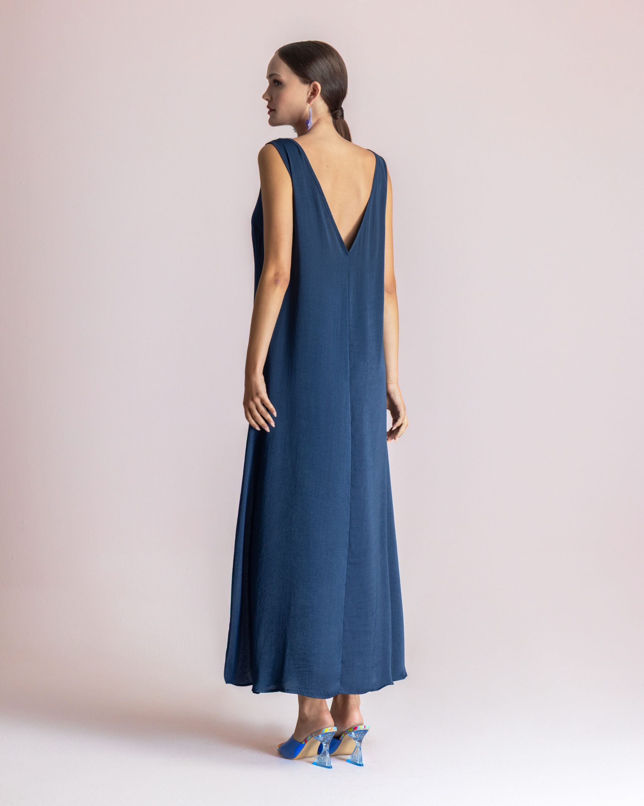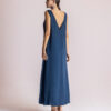 Navy MOUTAKI Satin Maxi Dress, αρχαιοελληνικό με φαρδιά ζώνη, χοντρή τιράντα και ελαφρώς ανοιχτή πλάτη. Δροσερό, καλοκαιρινό και κομψό για πολλές περιστάσεις.