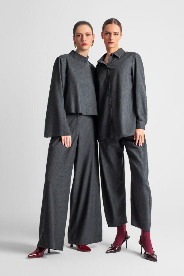 Η κανονική γραμμή του το καθιστά ιδανική επιλογή για καθημερινές και πιο επίσημες εμφανίσεις, προσφέροντας ευελιξία και κομψότητα. Το ριγέ μοτίβο σε γκρι απόχρωση προσθέτει μοντέρνο χαρακτήρα και μπορεί να συνδυαστεί εύκολα με πουκάμισα, t-shirts ή πλεκτά για ολοκληρωμένο look.
