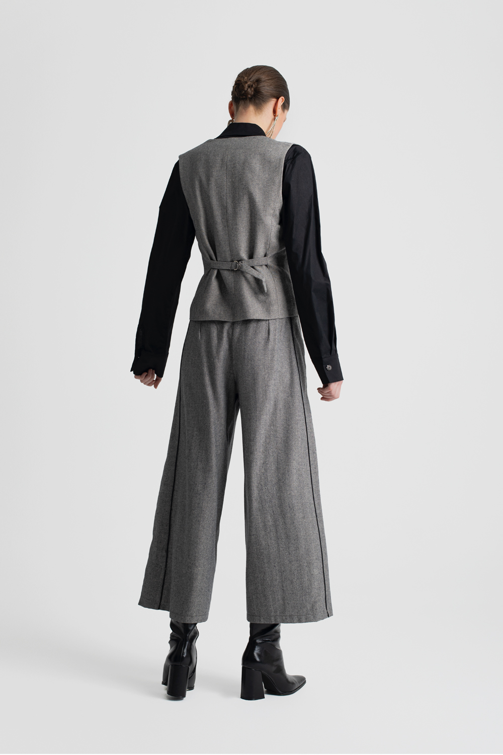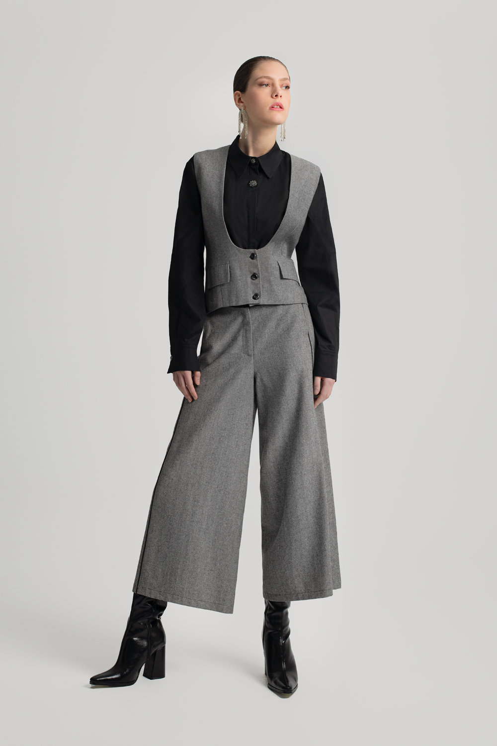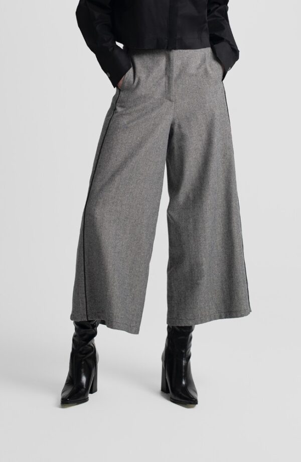 Ψηλόμεσες culottes MOUTAKI σε γκρι ψαροκόκκαλο σχέδιο με μαύρες ρίγες στο πλάι. Φαρδύ πόδι και ελαστική μέση για άνεση και κομψότητα.