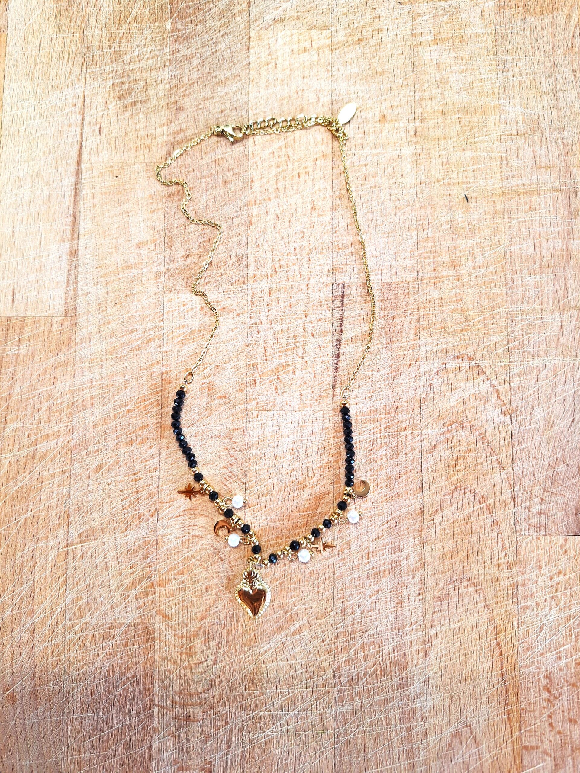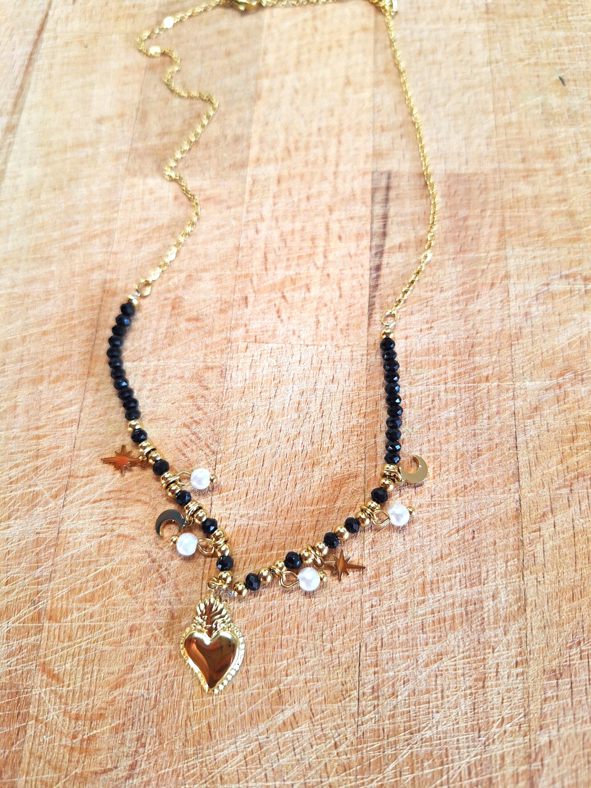 Δώστε χαρακτήρα και στυλ στις εμφανίσεις σας με αυτό το εντυπωσιακό κολιέ. Η χρυσή αλυσίδα συνδυάζεται με μαύρες χάντρες και λευκές λεπτομέρειες, ενώ τα κρεμαστά στοιχεία – φεγγάρι, αστέρι και καρδιά – προσδίδουν μια boho-chic αίσθηση με ρομαντικές και μυστηριώδεις πινελιές.