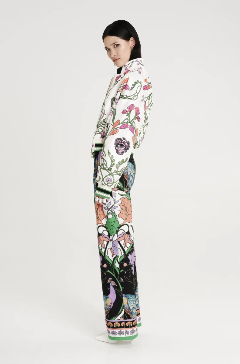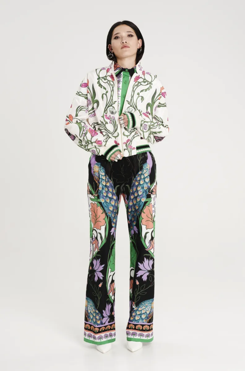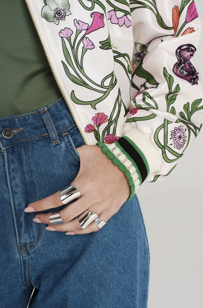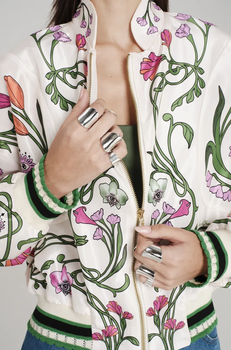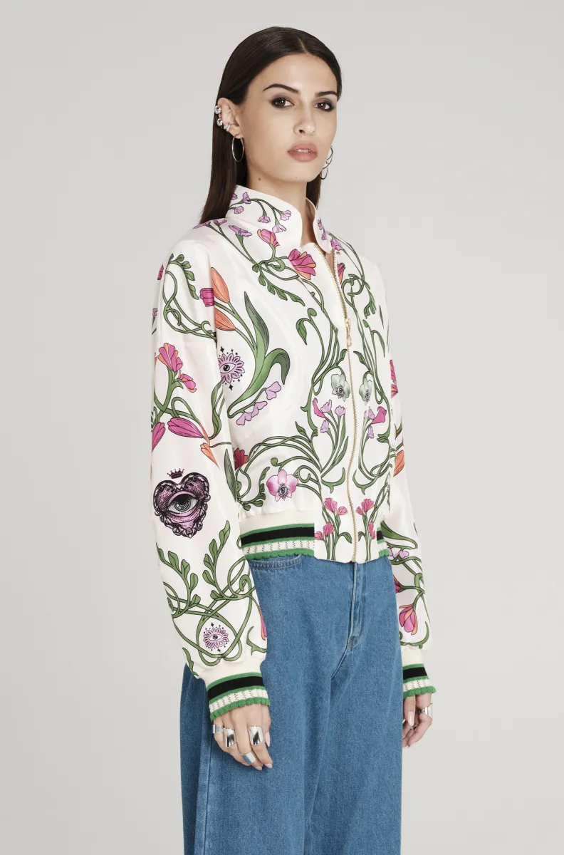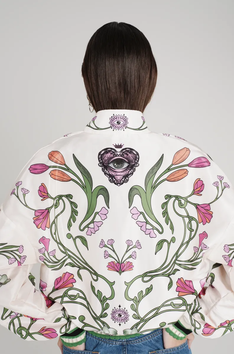 Bomber jacket PEACE AND CHAOS σε ecru taffeta με placement print, χρυσό μεταλλικό φερμουάρ και lace rib λεπτομέρειες.