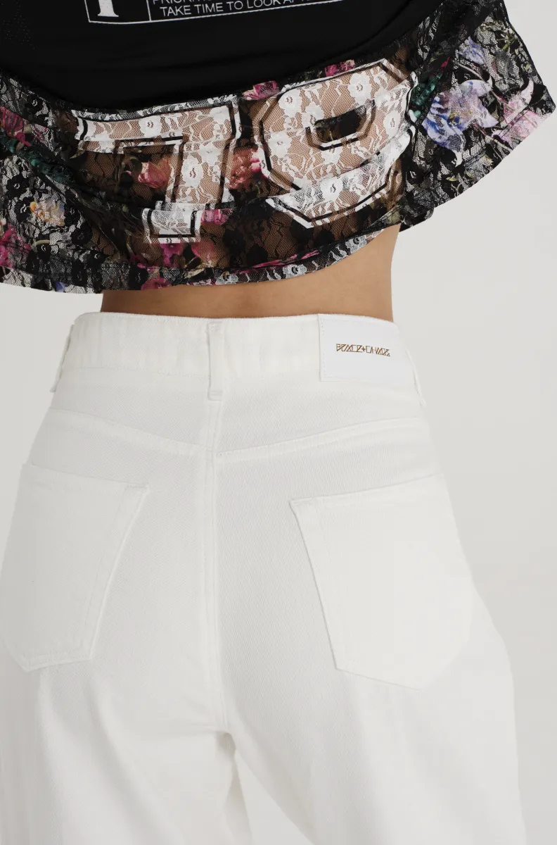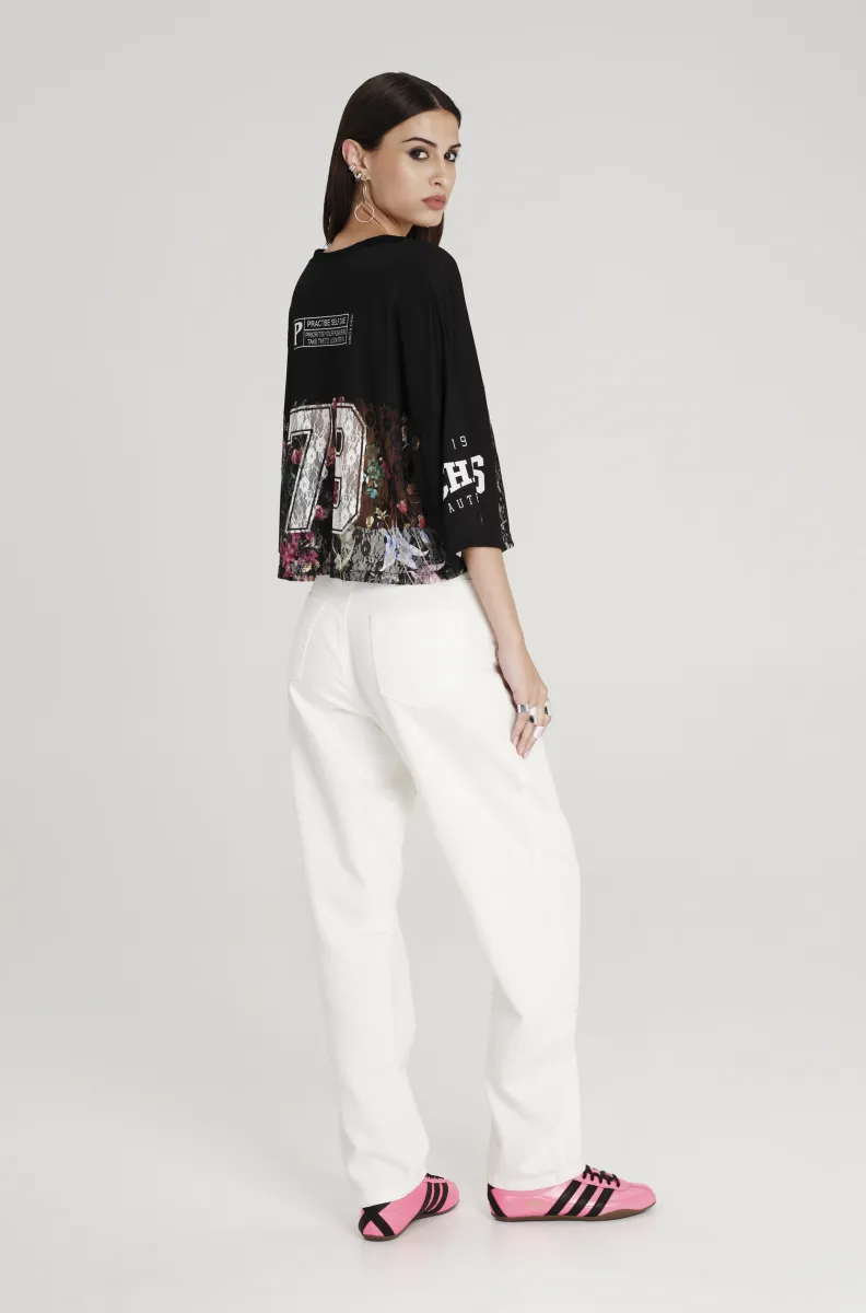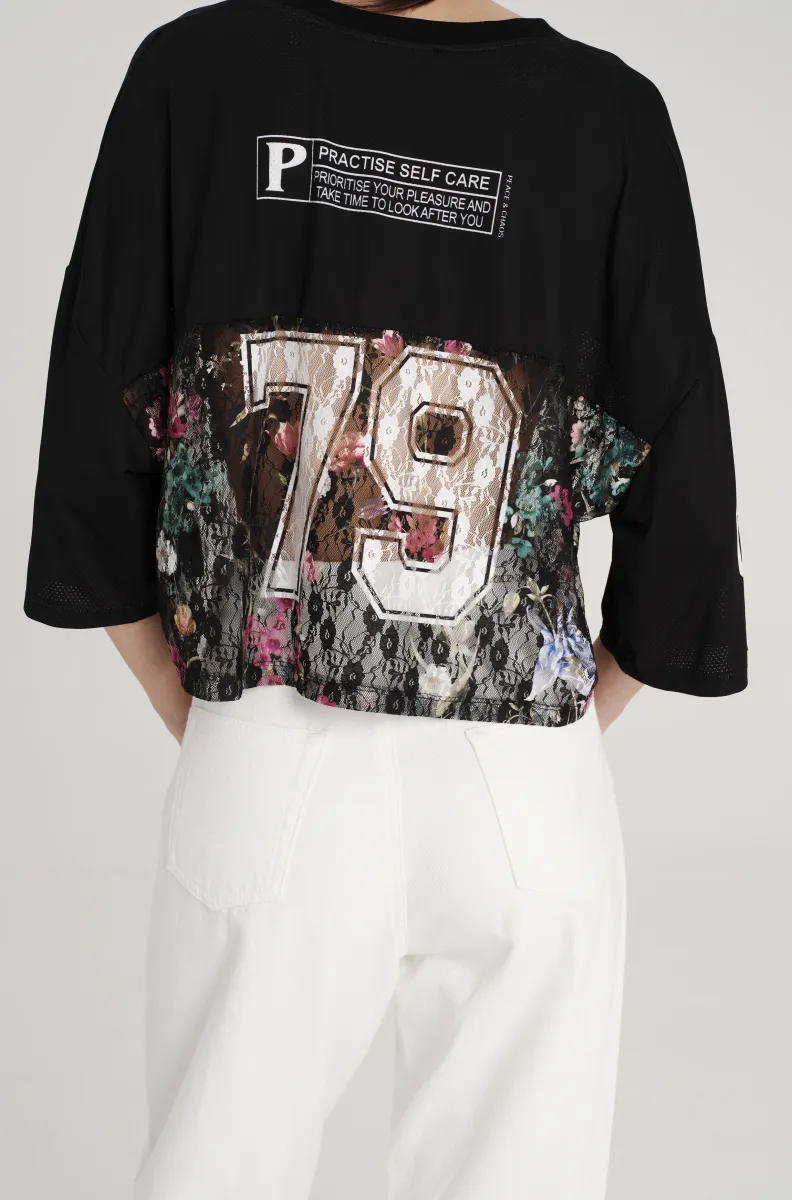 Το PEACE AND CHAOS Flowercore Top συνδυάζει sporty επιρροές με ρομαντικά lace στοιχεία, δημιουργώντας ένα μοναδικό fashion statement. Η delicate lace υφή συναντά το bird eye mesh panel, ενώ το placement print ενώνει athletic-inspired μοτίβα, self-care μηνύματα και florals πάνω σε μαύρη βάση.