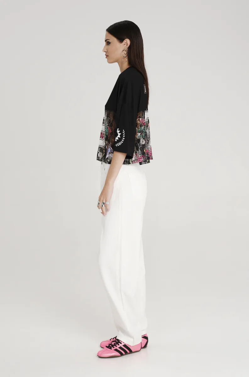 Lace crop top με bird eye mesh panel