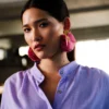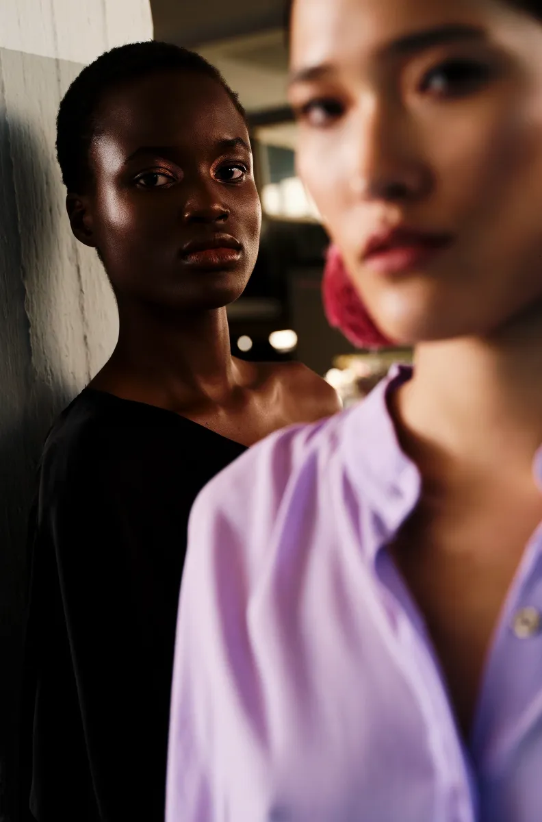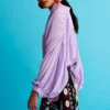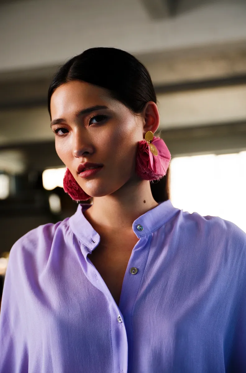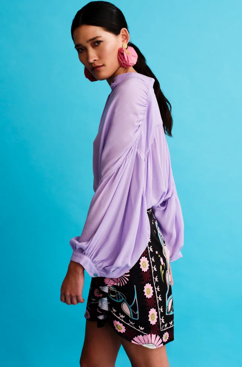 Τα bishop μανίκια με διακριτικές σούρες στις μανσέτες, στους ώμους και στο yoke δημιουργούν μια αέρινη κίνηση και χαρίζουν στο πουκάμισο την χαρακτηριστική oversized γραμμή του. Ο stand collar γιακάς, τα μεταλλικά κουμπιά και η μεταλλική λεπτομέρεια Chaka προσθέτουν μια μοντέρνα και ιδιαίτερη πινελιά.