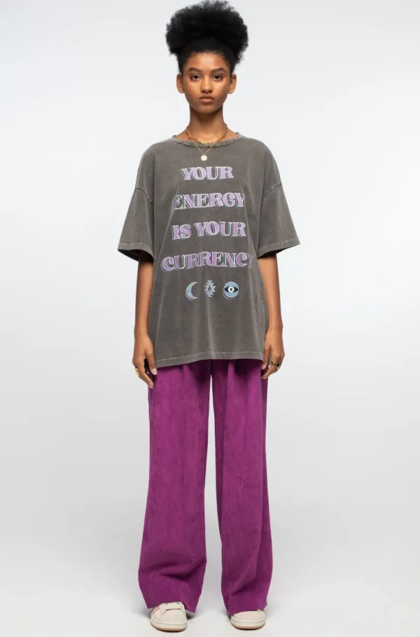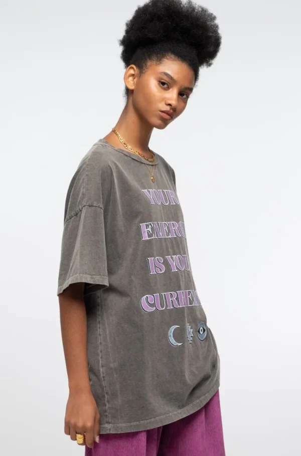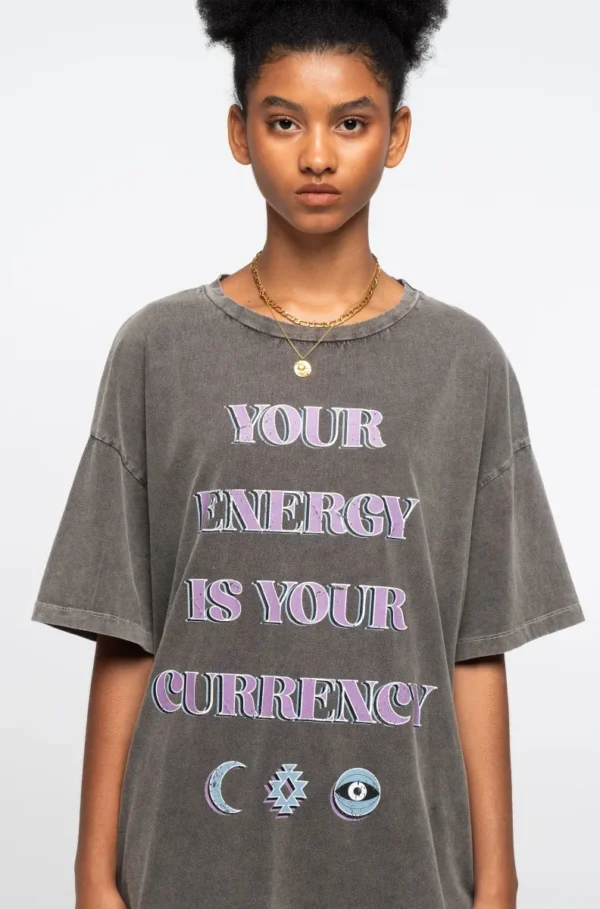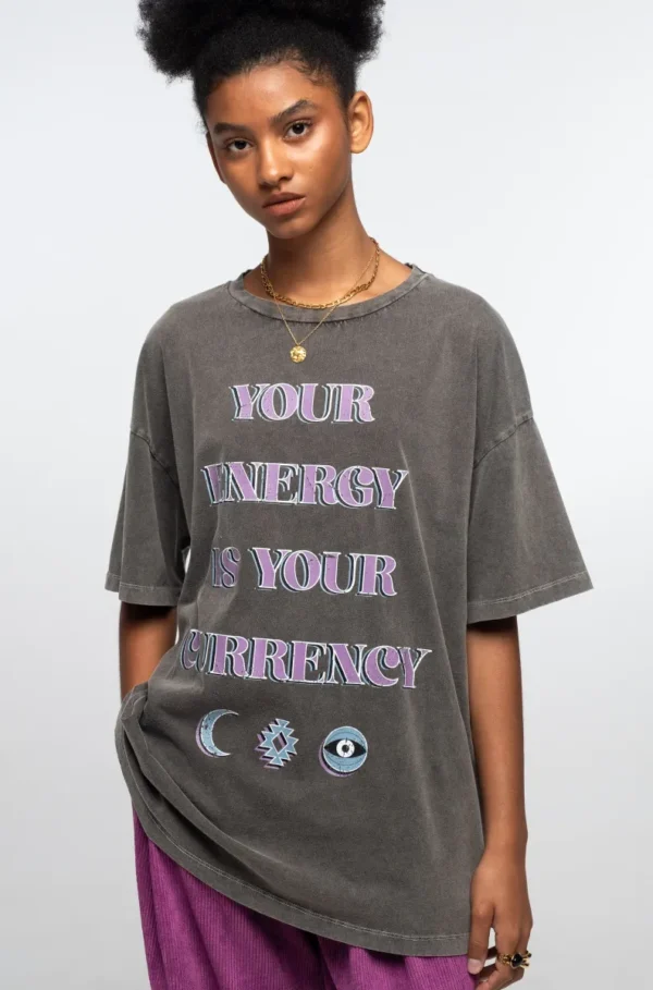 Το PEACE AND CHAOS Mantra T-shirt είναι κάτι περισσότερο από ένα basic κομμάτι. Με το μήνυμα “Your Energy is Your Currency” και συμβολικά prints, γίνεται το απόλυτο statement της γκαρνταρόμπας σας.