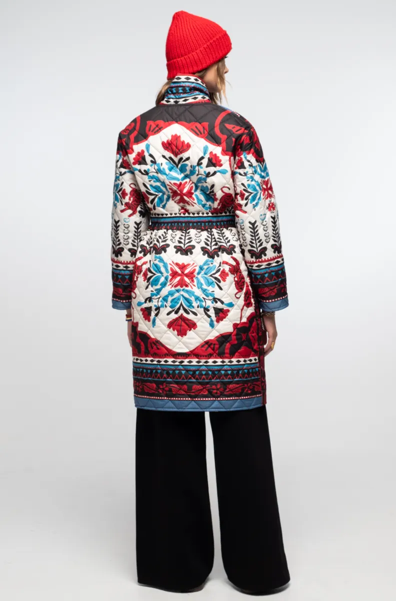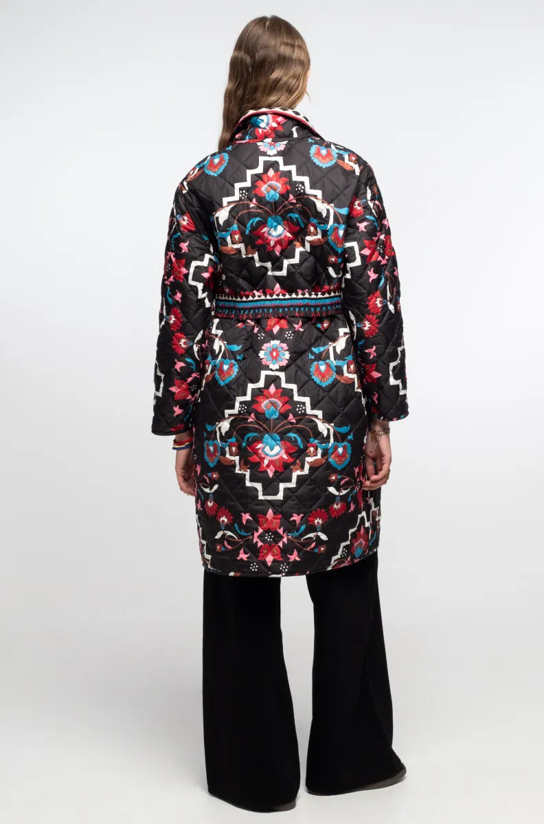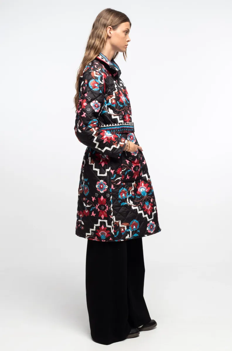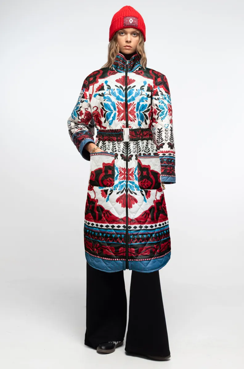 Αυτό το μακρύ, printed puffer jacket διαθέτει μεγάλες τσέπες και stretch ζώνη με αγκράφα μαύρου νικελίου για να δίνει έμφαση στη μέση και να ολοκληρώνει τη σιλουέτα.
