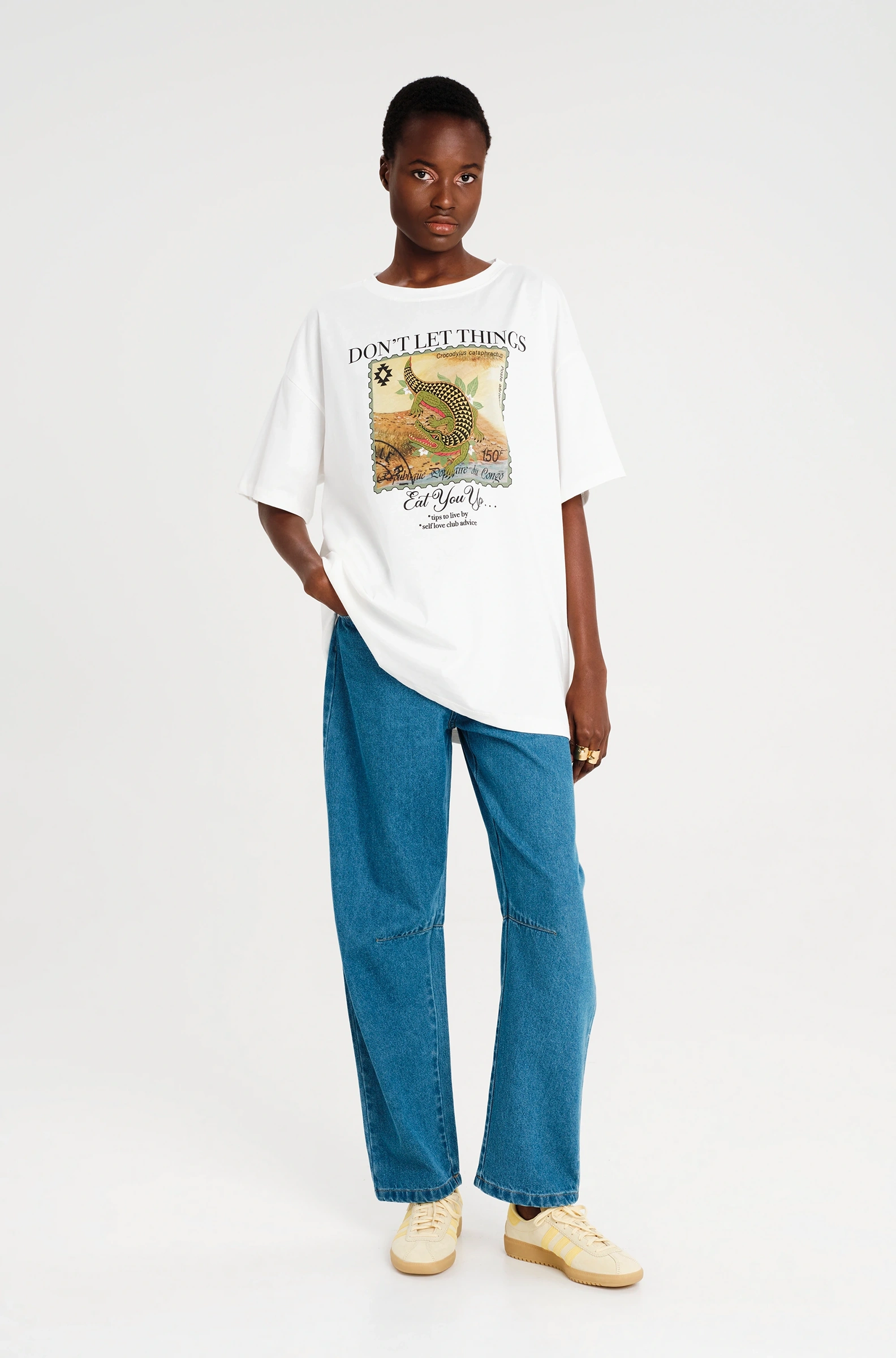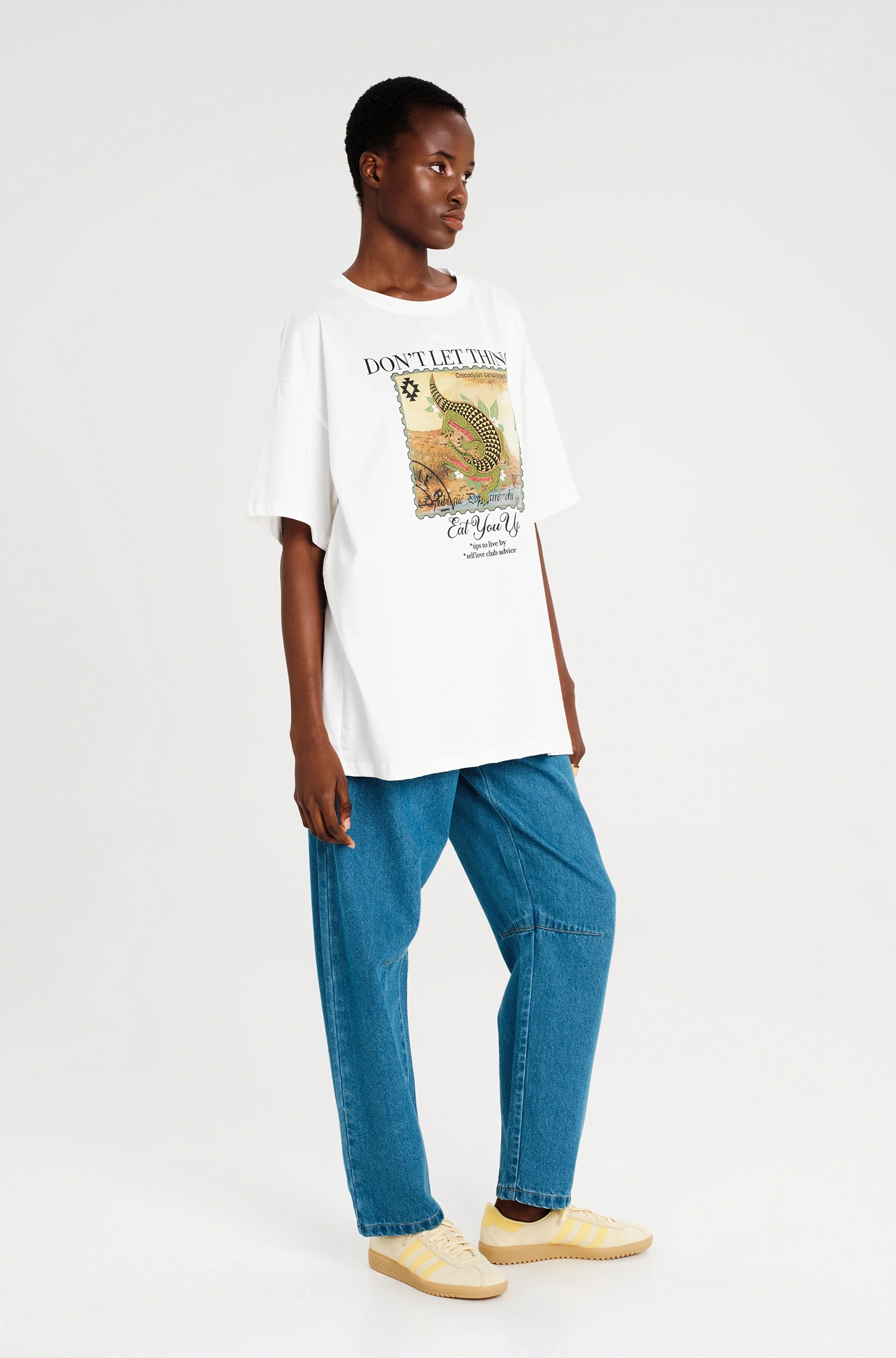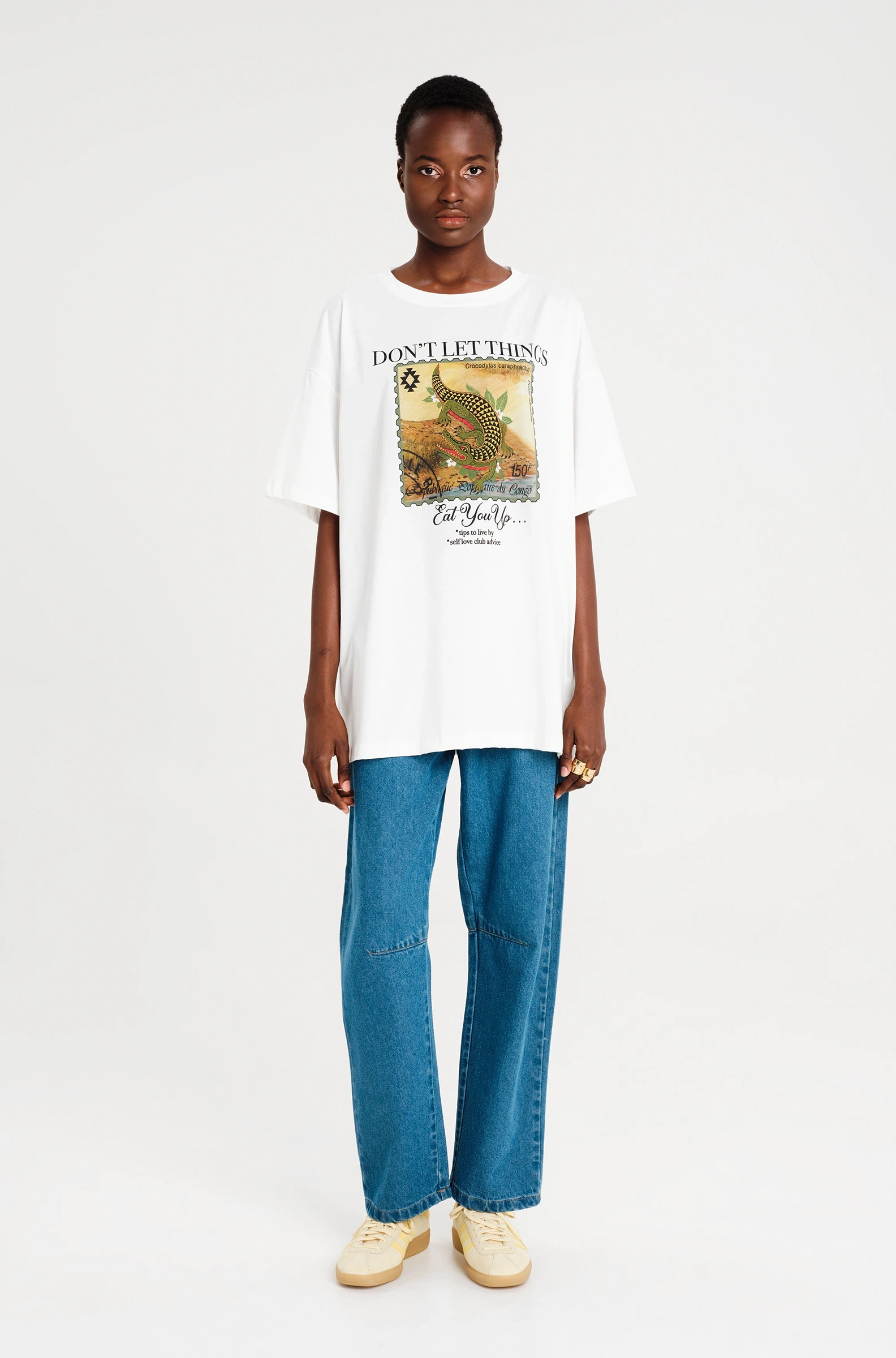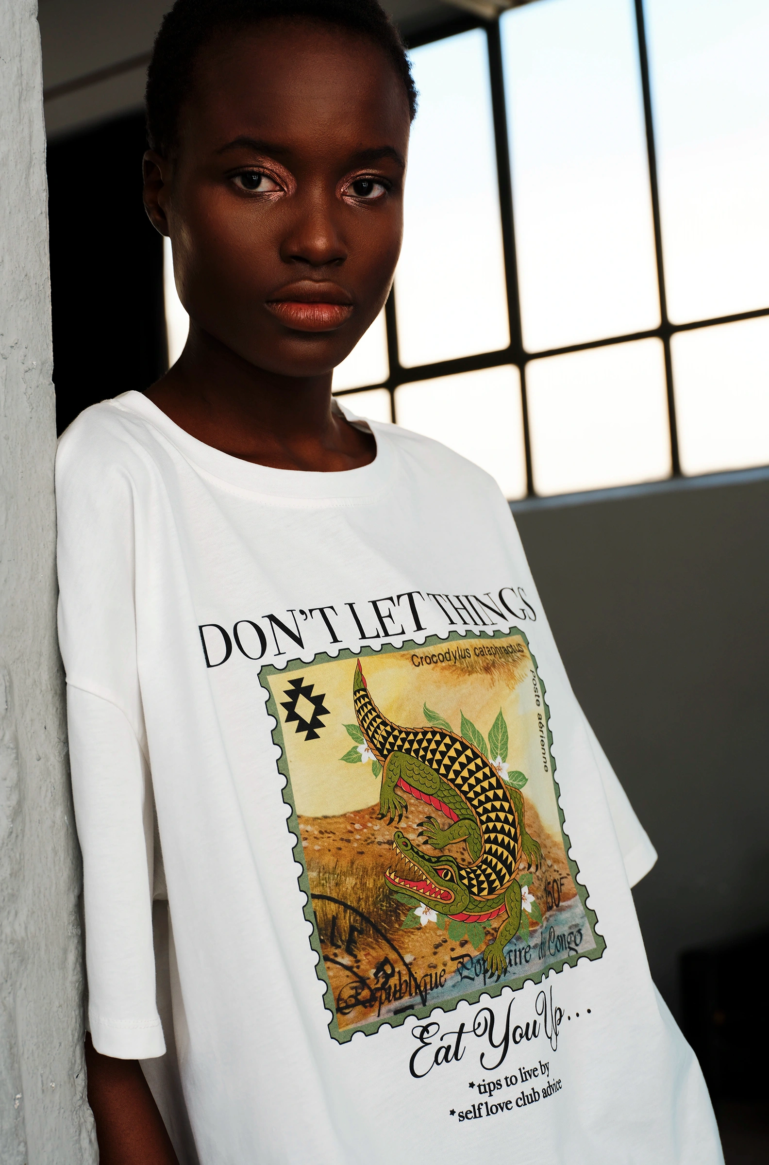 Το PEACE AND CHAOS Reptile T-Shirt είναι ένα statement cotton tee που συνδυάζει άνεση και προσωπικότητα. Το bold graphic print απεικονίζει ένα sacred crocodile μέσα σε ένα postage stamp frame, θυμίζοντας με ένα παιχνιδιάρικο τρόπο ότι δεν πρέπει να αφήνουμε τα πράγματα να μας «καταβροχθίζουν».