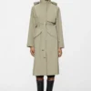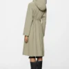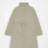 Η Α-line γραμμή προσφέρει θηλυκή σιλουέτα, ενώ η αποσπώμενη ζώνη επιτρέπει πιο εφαρμοστό styling. Το αδιάβροχο φερμουάρ είναι διακριτικά κρυμμένο πίσω από πατιλέτα, διατηρώντας καθαρές γραμμές.