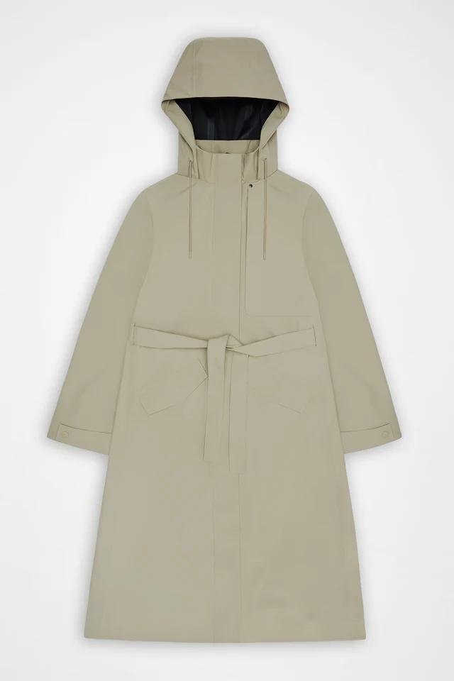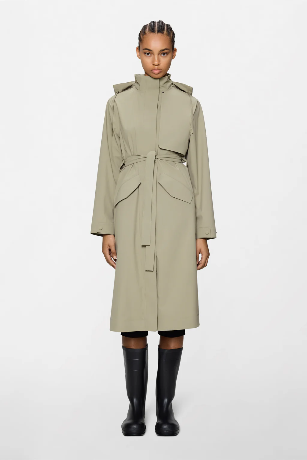 Η Α-line γραμμή προσφέρει θηλυκή σιλουέτα, ενώ η αποσπώμενη ζώνη επιτρέπει πιο εφαρμοστό styling. Το αδιάβροχο φερμουάρ είναι διακριτικά κρυμμένο πίσω από πατιλέτα, διατηρώντας καθαρές γραμμές.