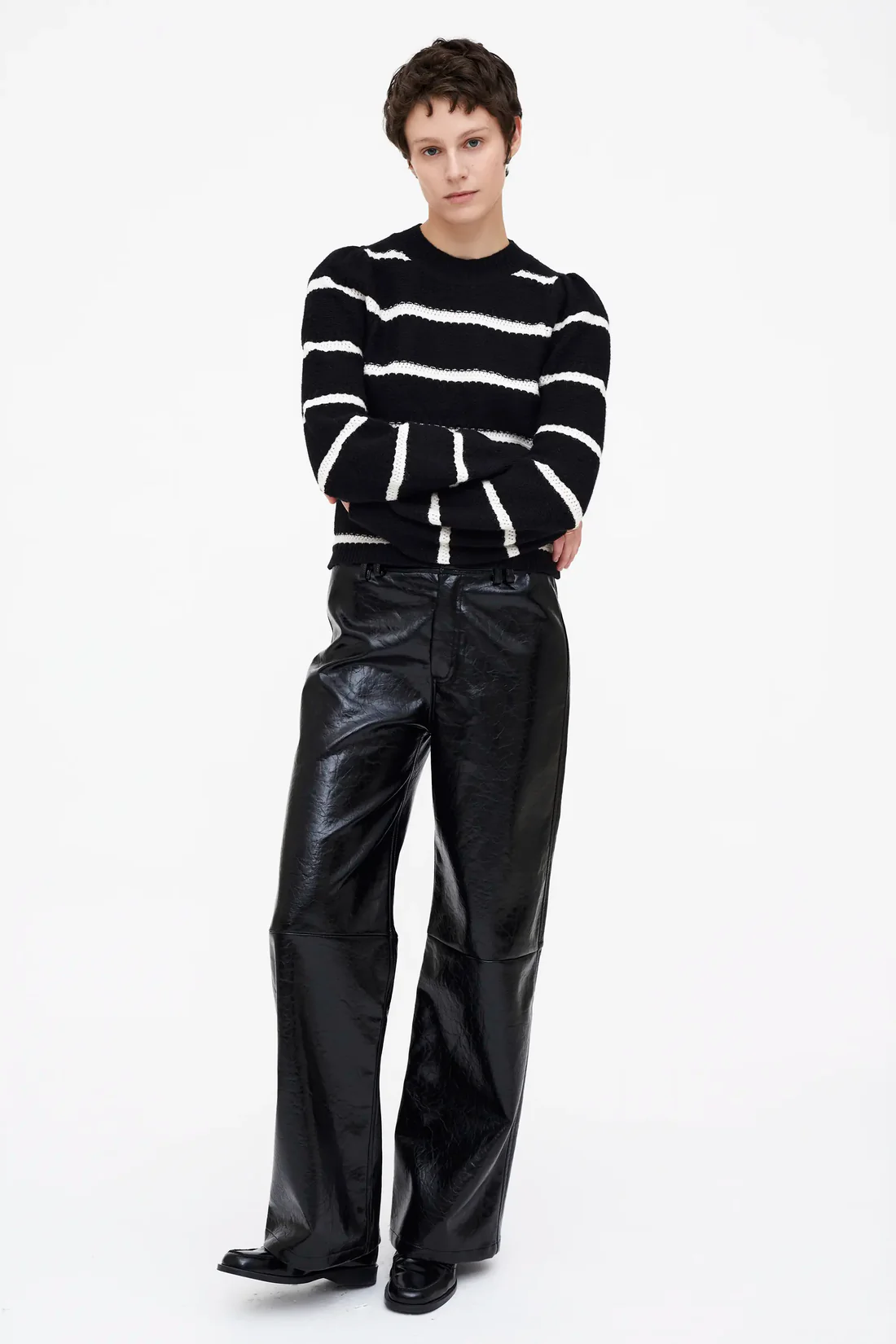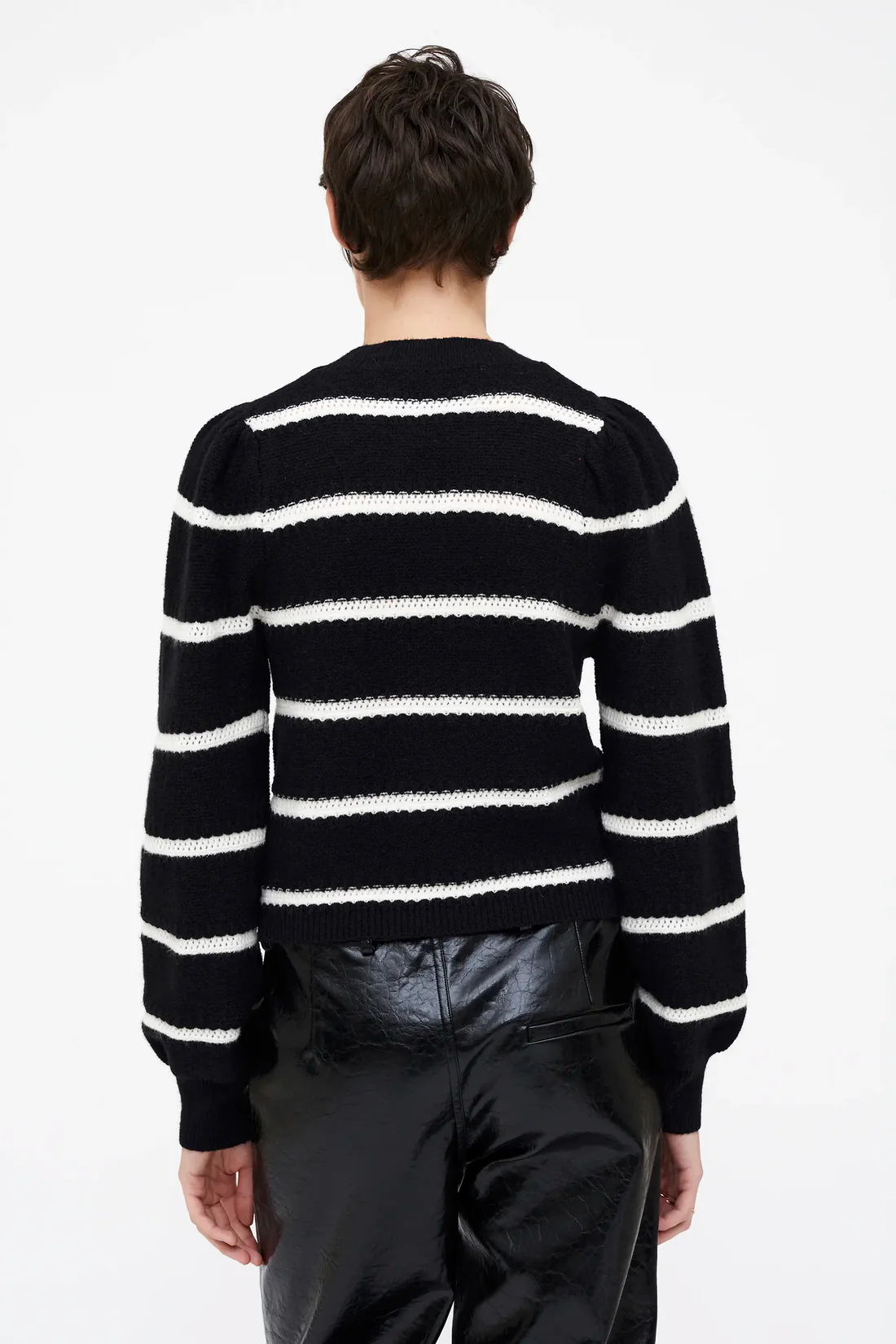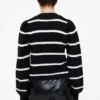 Με στρογγυλή λαιμόκοψη και μακριά ριμπ μανίκια, δημιουργεί ένα κομψό silhouette που αγκαλιάζει το σώμα χωρίς να περιορίζει την άνεση. Ο ασπρόμαυρος ριγέ σχεδιασμός προσδίδει μοντέρνα και δυναμική εμφάνιση, καθιστώντας το ιδανικό για layering πάνω από T-shirts ή για να φορεθεί μόνο του με τζιν, παντελόνι ή φούστα.