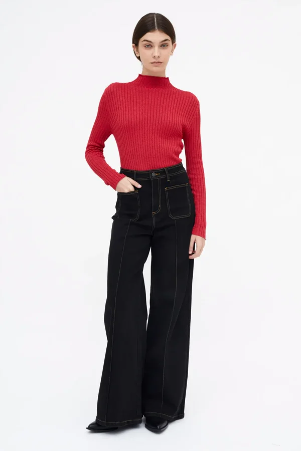 Το WILD PONY Red Ribbed Knit Top with Perkins Collar είναι ένα statement top που συνδυάζει άνεση και κομψότητα. Κατασκευασμένο από μαλακό μίγμα βισκόζης και πολυεστέρα, διαθέτει ριμπ ύφασμα με lurex λεπτομέρειες που προσθέτουν διακριτική λάμψη.