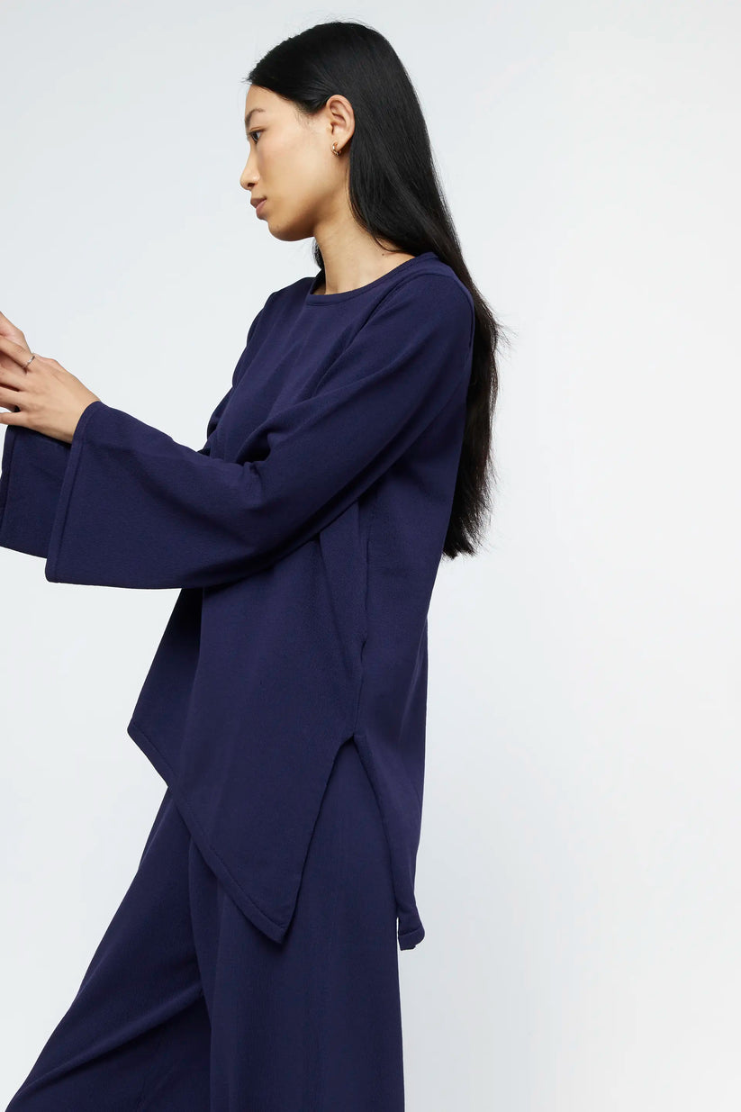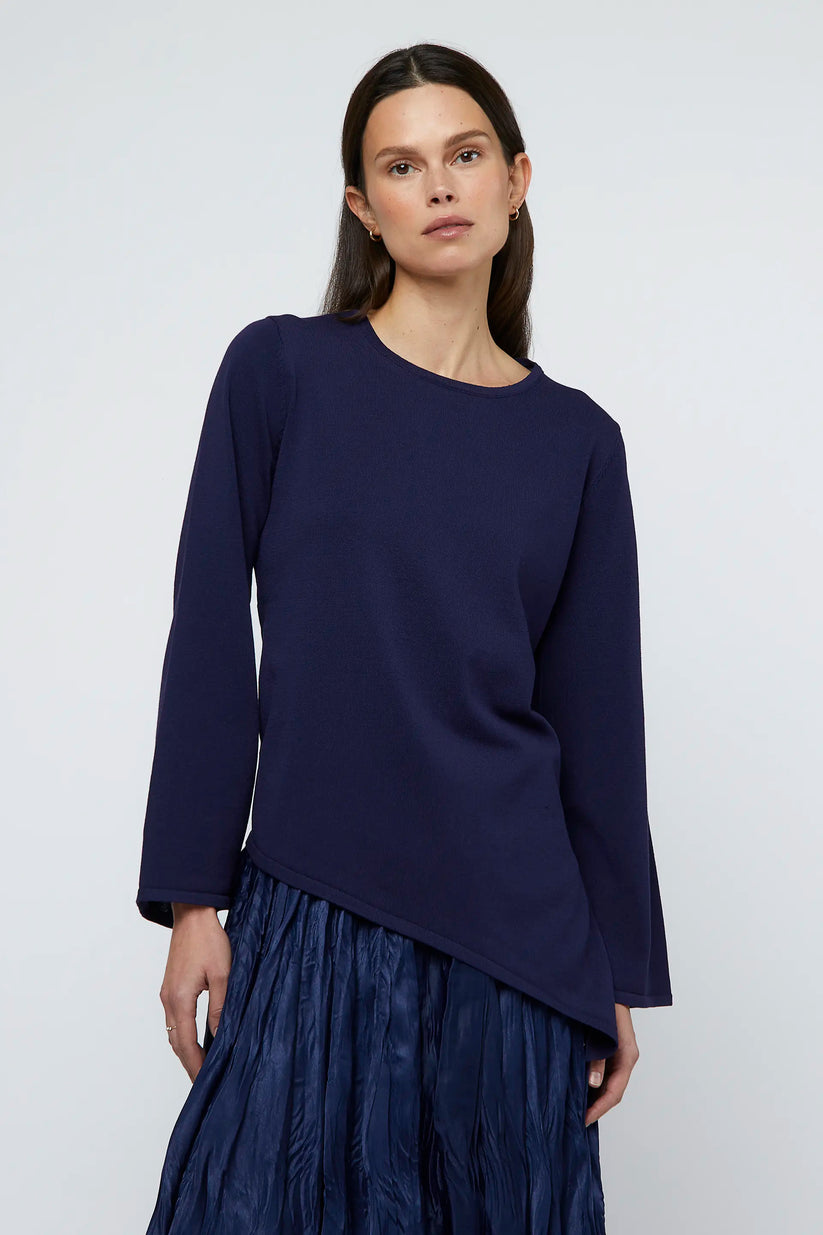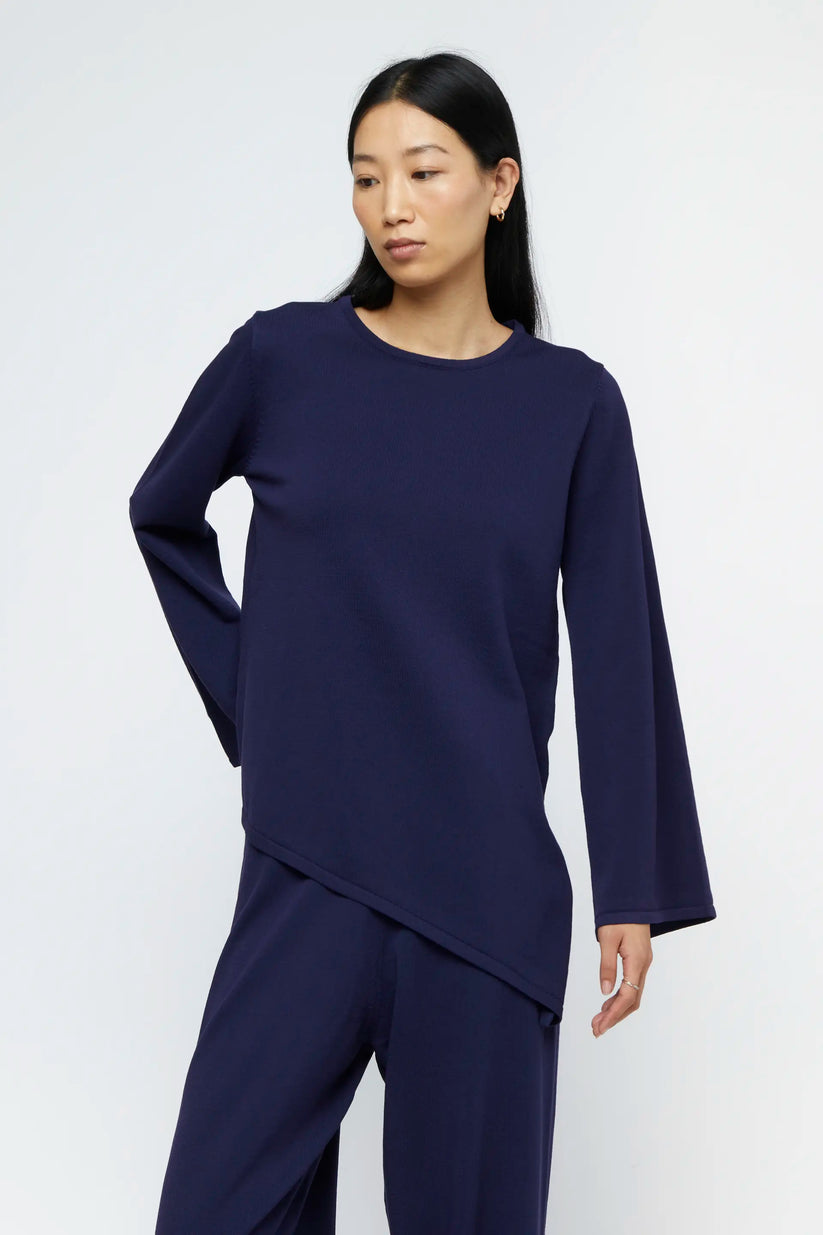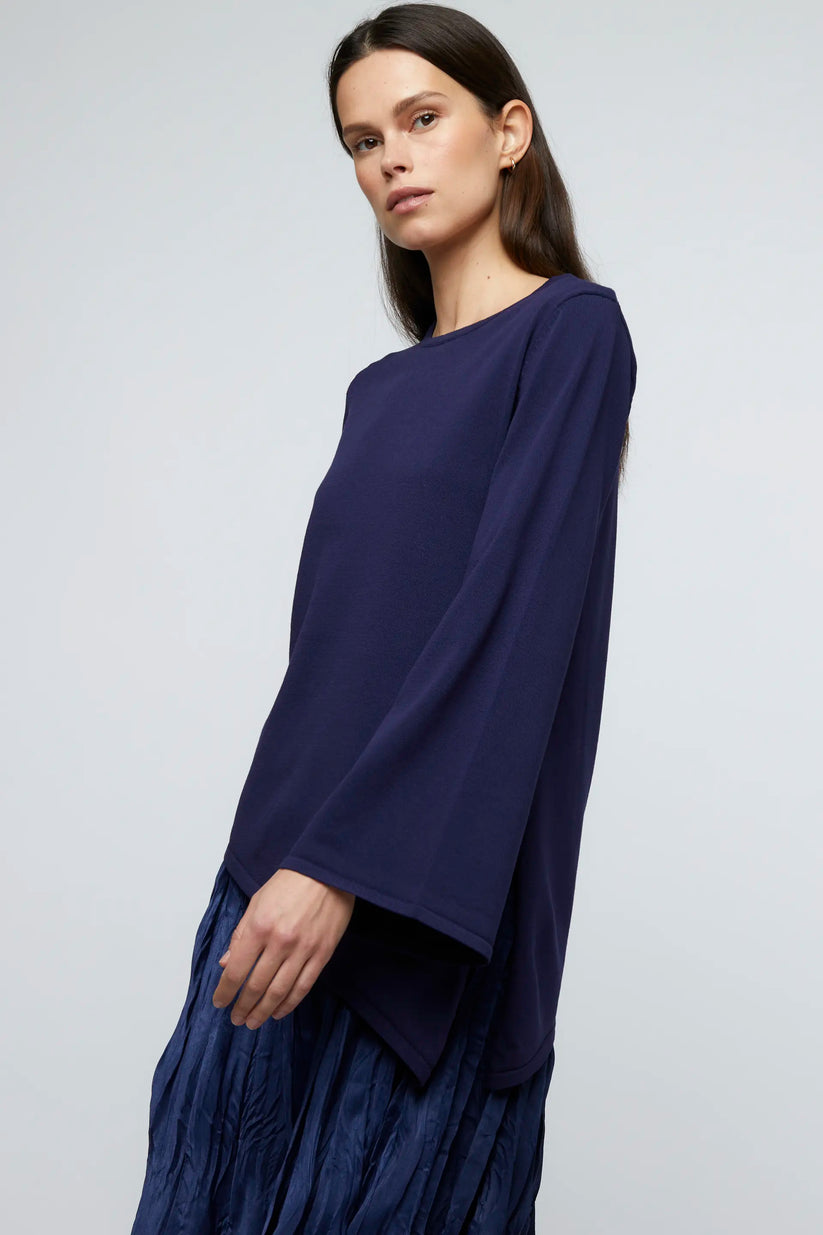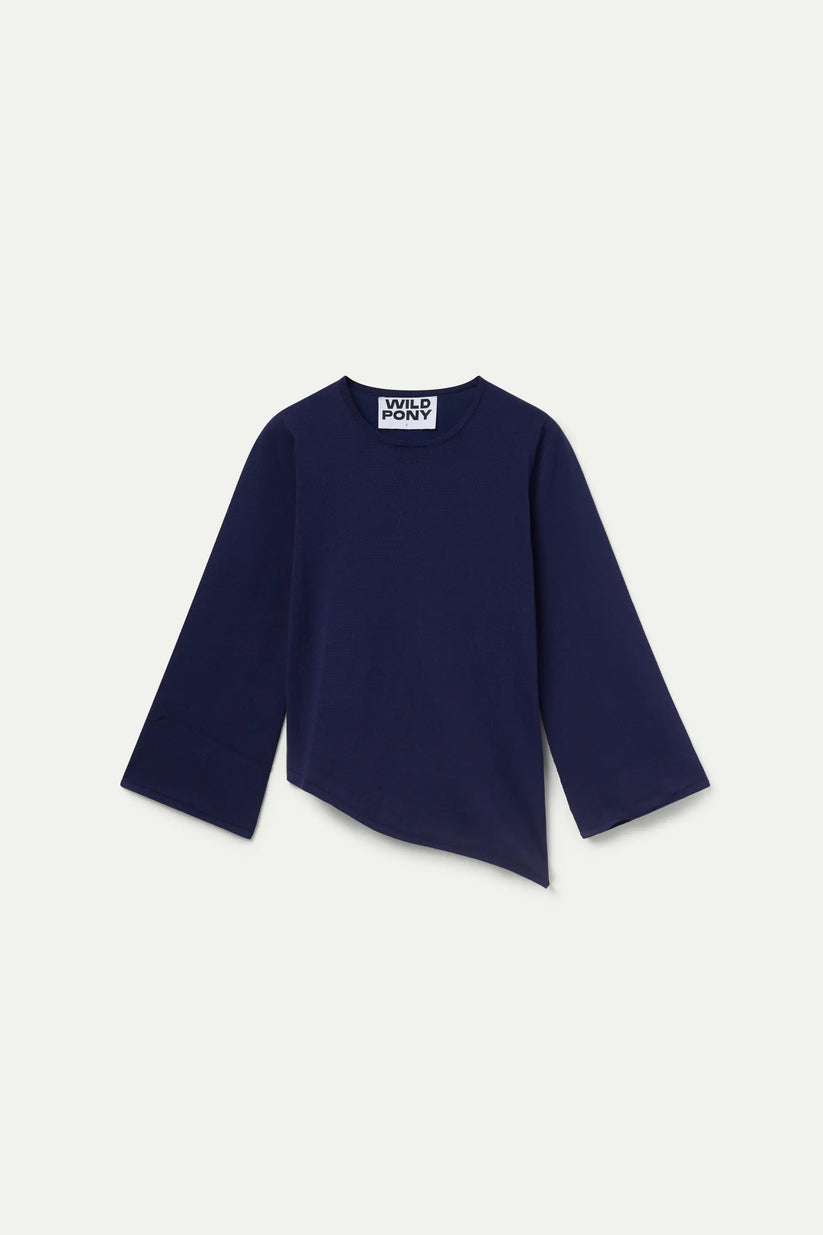 Πλεκτή μπλούζα σε σκούρο μπλε (navy blue), ιδανική για κομψές καθημερινές εμφανίσεις. Διαθέτει στρογγυλή λαιμόκοψη, μακριά φαρδιά μανίκια και ασύμμετρο τελείωμα με σκίσιμο στο πλάι, που χαρίζει μοντέρνα γραμμή και άνετη εφαρμογή. Η μαλακή της υφή την καθιστά ιδανική για layering ή για ξεχωριστά outfits με ιδιαίτερο χαρακτήρα.